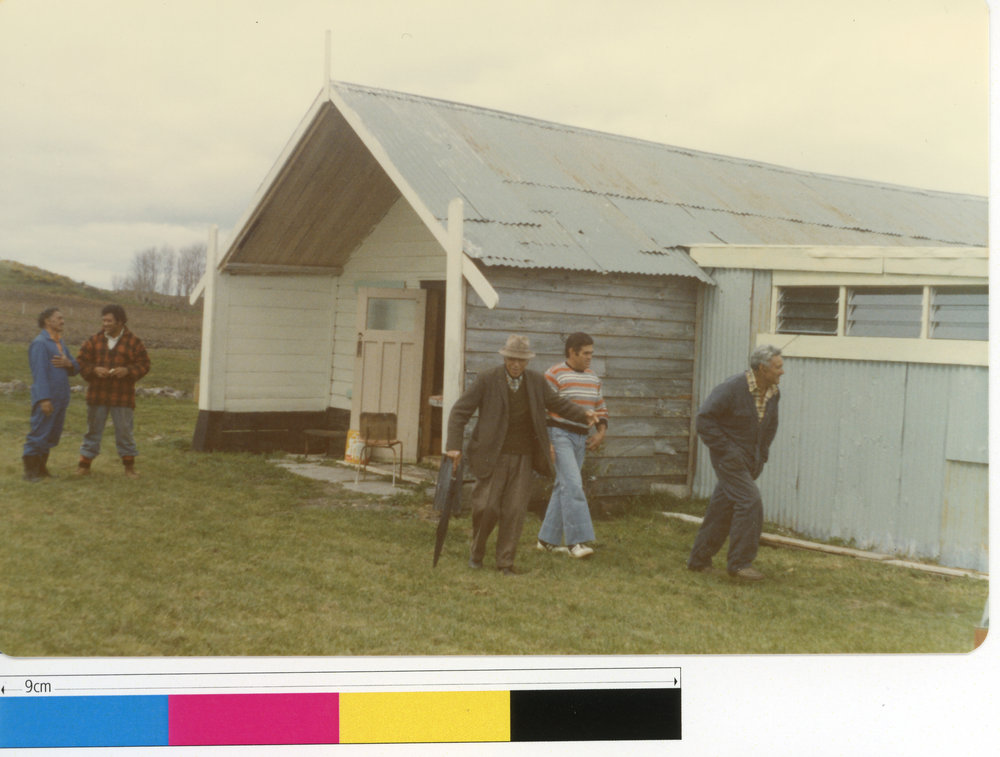 Kaikohe Rolleston, Ron Taingahue, & Wiremu Gardiner outside Tamaoho wharenui (Ams 248) (1975 to 1985). Pae Korokī, accessed 03/04/2026, https://paekoroki.tauranga.govt.nz/nodes/view/24472