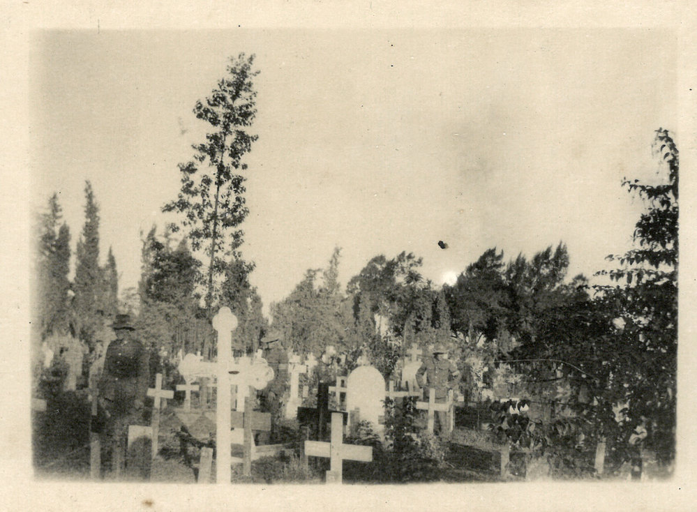 Date1914-1918Reference NumberPhoto 13-685DescriptionSoldiers visiting a cemetery. Photo from a WWI album (1914-1918) taken by his Father Harrison, Arthur Charles, 1894-1994. FormatPrintSource of AcquisitionHugh HarrisonPhotographer/CreatorHarrison, Arthur Charles, 1894-1994