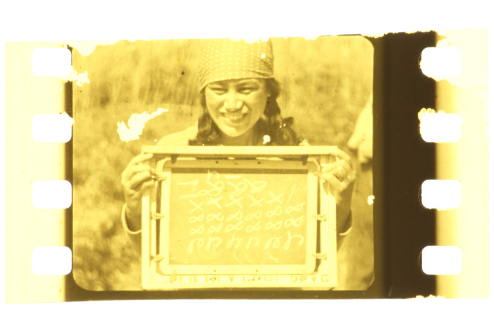 Date1930Reference NumberPhoto 19-247DescriptionA Māori girl holding onto a small screen with written text and symbols on it. Image taken during the filming of the Hei Tiki (1935) film in 1930. The girl appears to be wearing a bandana of some sort. Photographer unknown. It is possible that the photographer could have been Ted Coubrey or Henry Hopecross (both the cameramen for the Hei Tiki 1935 film). Image donated to the Tauranga City libraries by Tim Dalton (antique dealer) from the Margaret Goulding Estate. Image is in public domain. The Hei Tiki Film positives are part of AMS 227. FormatPositivePhysical DescriptionSingle frame of a section of nitrate film