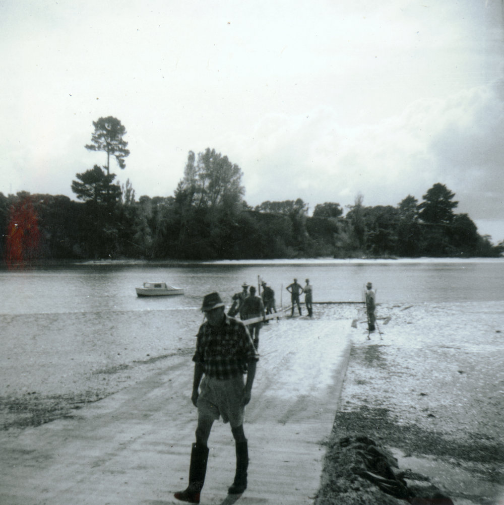 Date1964Reference NumberPhoto 05-415DescriptionExtension to boat ramp, by 42 ft, 11 April 1964, resulting in a total length of 144 ft. Used 6 yds of Readymix concrete. Holmes Holiday Haven, Te Puna, on the shores of Tauranga harbour; early 1960s.FormatPrintPhysical Descriptionblack and white print