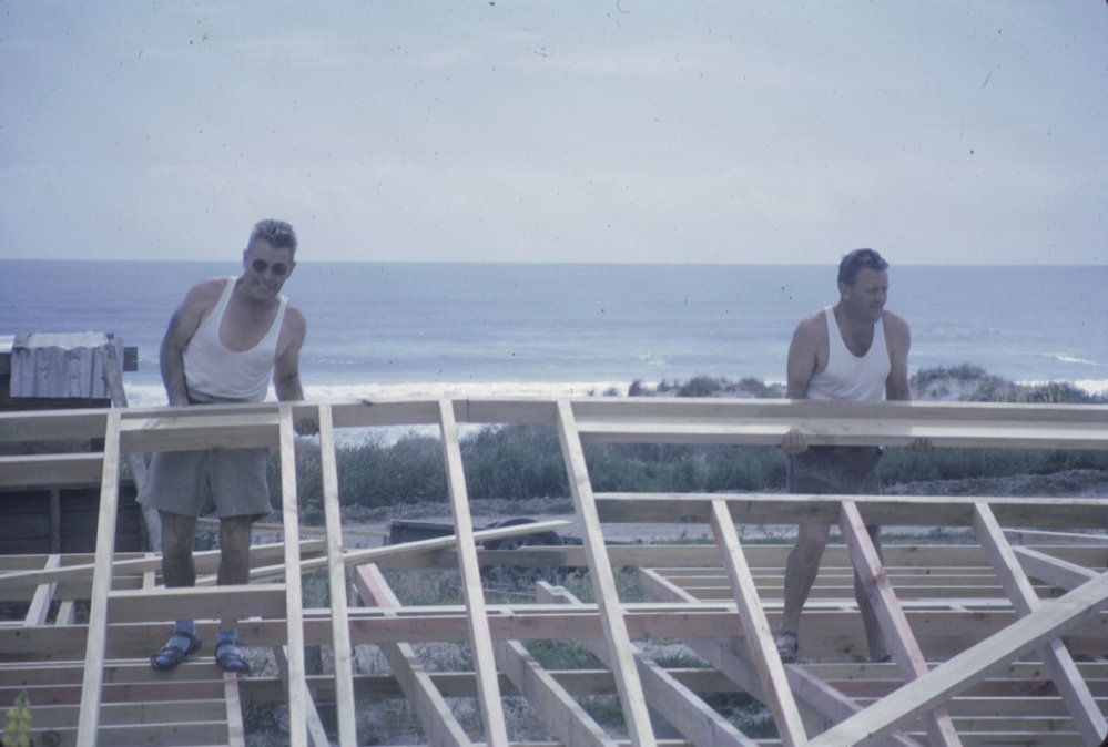Date1960sReference NumberPhoto 06-419DescriptionTwo men building at Mount Maunganui, early 1960s. Preparing to lift a timber frame.FormatPrintPhysical Descriptioncol slide