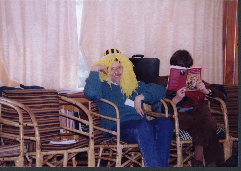 Chris Worth in wig, Tauranga Library 1992 (1992). Pae Korokī, accessed 27/03/2026, https://paekoroki.tauranga.govt.nz/nodes/view/25861
