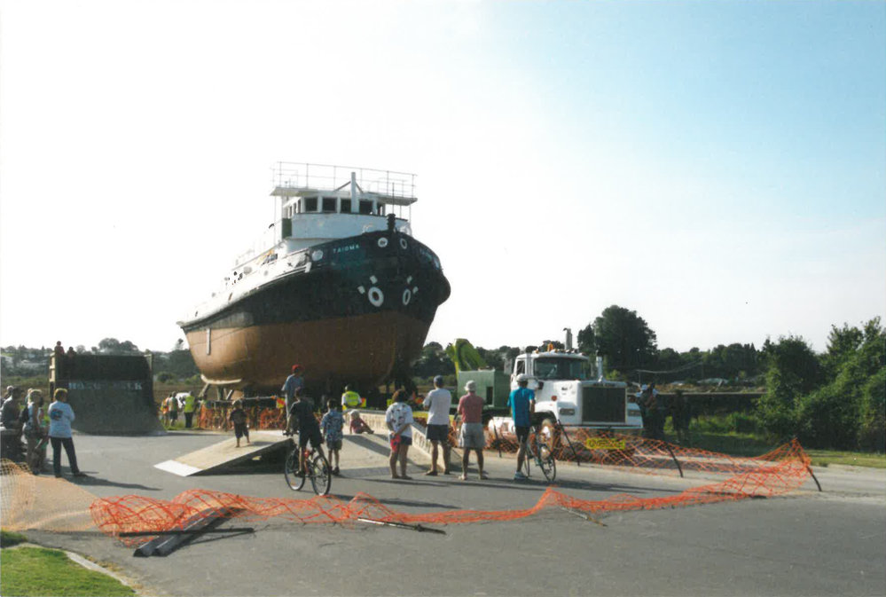 Date2000Reference NumberPhoto 14-0139DescriptionHistoric Village Taioma tug on trailer about to haul 2000. In 2000 a project began to move the Taioma from where it rested at the Historic Village, with the intention of creating a dive site off the South-eastern side of Mōtītī Island. A 128 wheel trailer was fitted underneath the tub before it began a journey down Takitimu expressway to the slipway at the northern side of the harbour bridge. Once afloat once more, the tug was itself tugged across the harbour and out to Mōtītī where it was scuttled. Over 150 artefacts from the Taioma, including the great prop (formerly outside the RSA on Cameron Road, and now currently at Sulphur Point), steam whistle and port holes, were put up for auction to help pay for the project. Four men from the steam group at Ferrymead Heritage Park travelled to Tauranga to strip the tug of small materials such as gauges for their museum. FormatPrintSource of AcquisitionGraham Macgregor