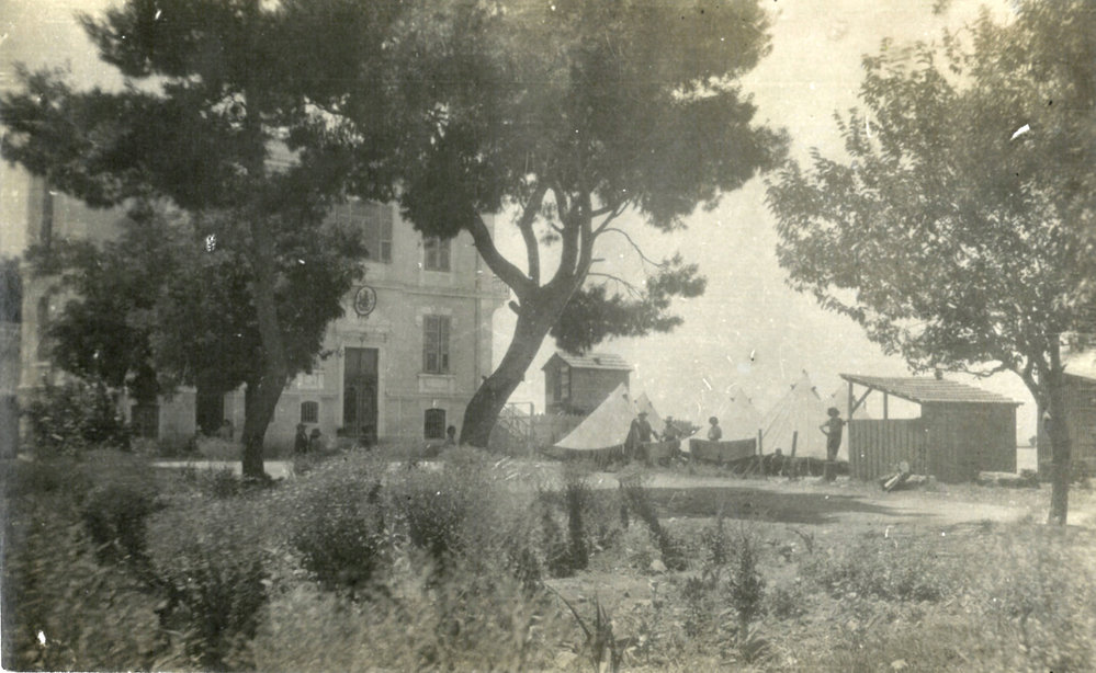 Date1914-1918Reference NumberPhoto 13-1515DescriptionSoldiers by tents next to two story building. FormatPrint