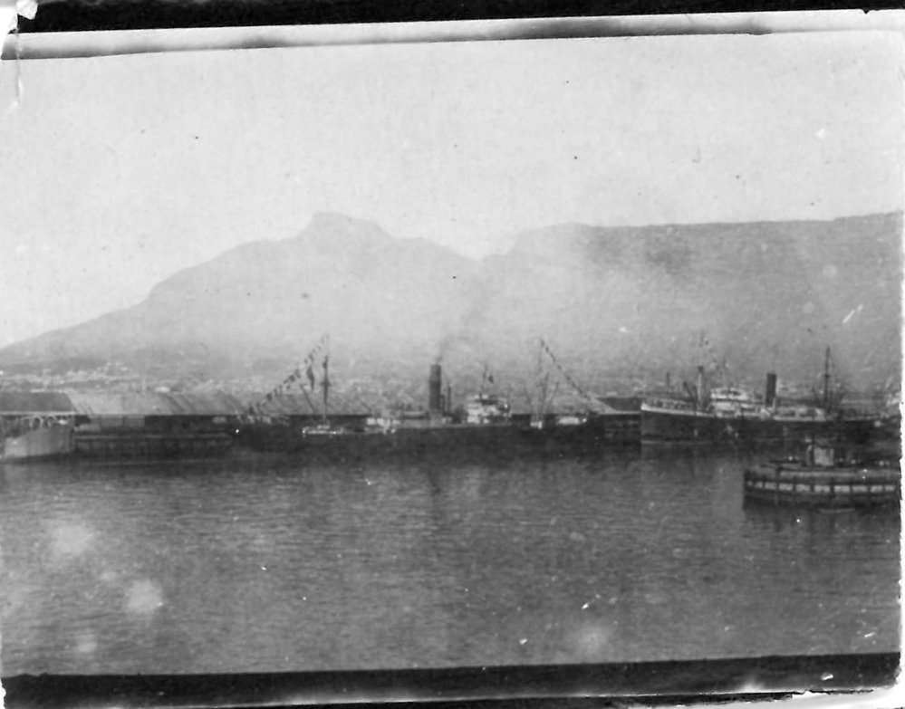 Date1914-1918Reference NumberPhoto 13-1547DescriptionSeveral steamships docked in harbour. Location unidentified. Looks like Table Mountain in Cape Town.FormatPrint
