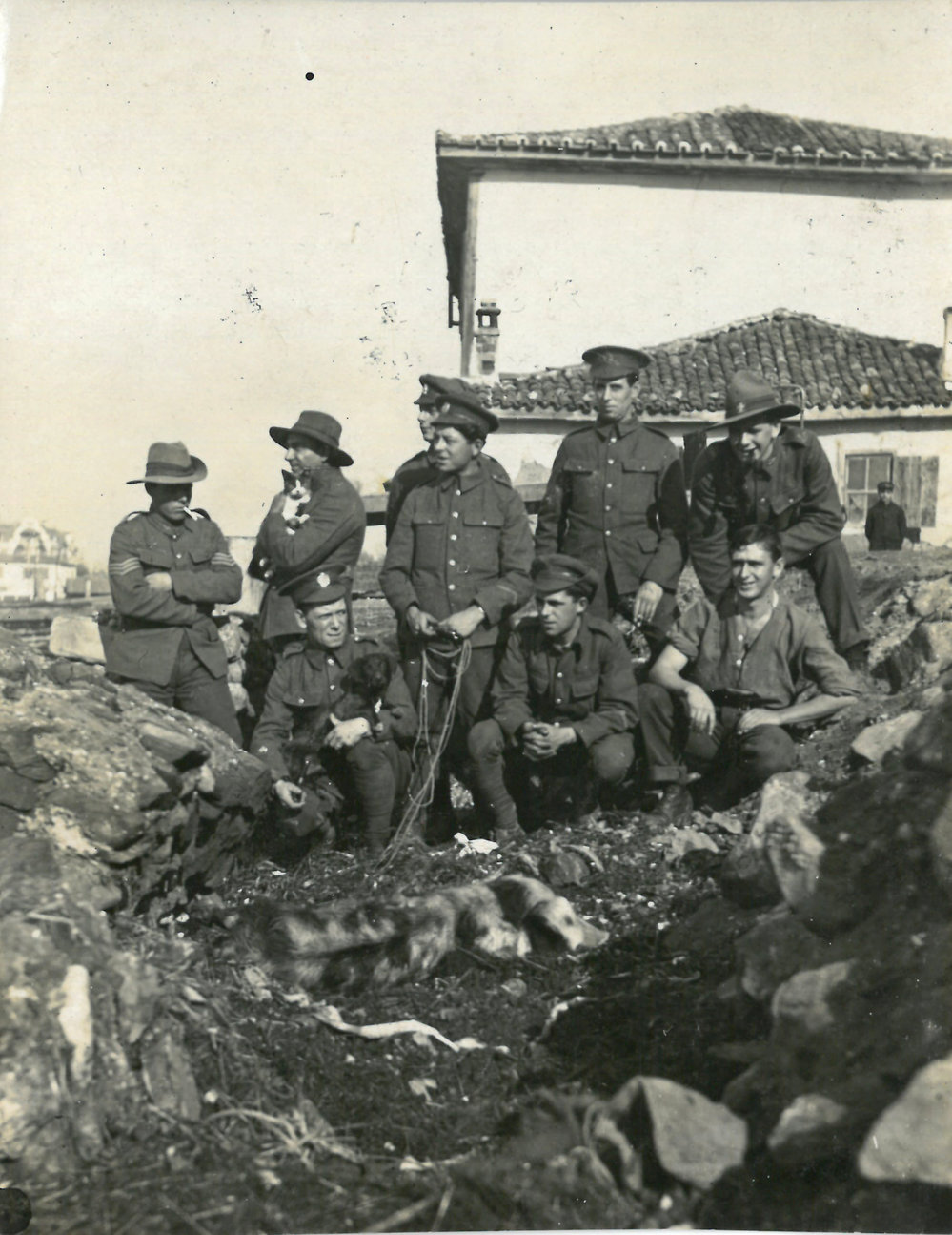 Date1914-1918Reference NumberPhoto 13-1564DescriptionInformal group portrait in the Balkans during WWI. a soldier with a cat in his arms and another a dog, are visible. FormatPrint