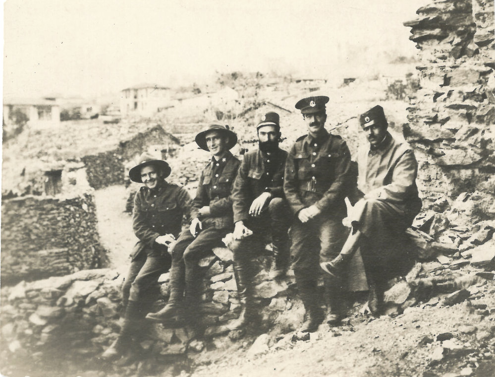 Date1914-1918Reference NumberPhoto 13-1566DescriptionAn informal group portrait on a stone wall within a local village. FormatPrint