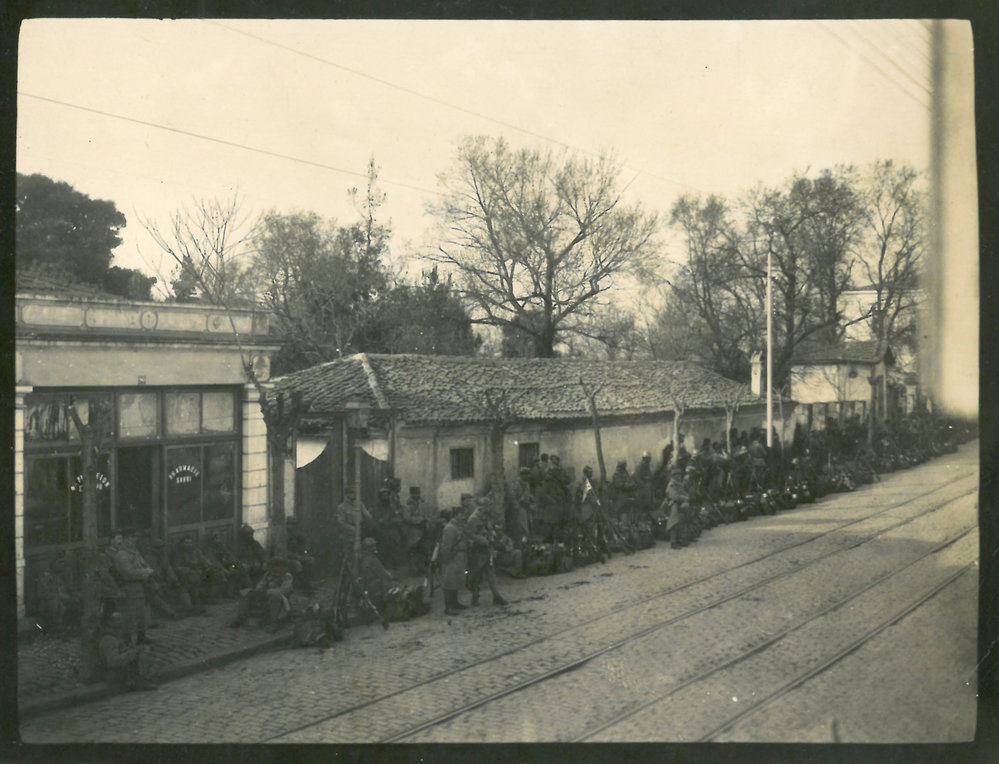 Date1914-1918Reference NumberPhoto 13-1573Description soldiers lining a cobblestone village street. FormatPrint