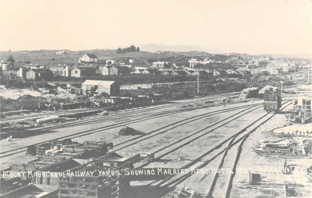 Mount Maunganui railway yards showing married men's huts 1922