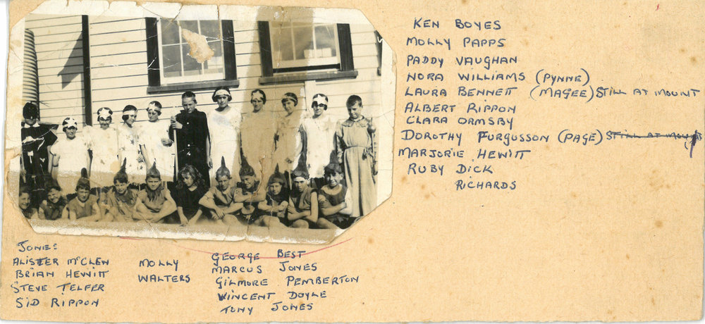 Date1926Reference NumberPhoto 13-559DescriptionPhotograph of Mount Maunganui Primary School students c 1926. From images collected during centenary celebrations 2013. Sitting: Jones - Alister McClew - Brian Hewitt - Steve Telfer - Sid Rippon - Molly Walters - George Best - Marcus Jones - Gilmore Pemberton - Vincent Doyle - Tony Jones. Standing: Ken Boyes - Molly Papps - Paddy Vaughan - Nora Williams (Pynne) - Laura Bennett(Magee) - Albert Rippon - Clara Ormsby - Dorothy Furgusson(Page) - Marjorie Hewitt - Ruby Dick - Richards. Acknowledgement L. Magee FormatPrint