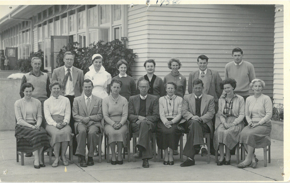 Date1958Reference NumberPhoto 13-552DescriptionPhotograph of Mount Maunganui Primary School Staff 1958. From images collected during centenary celebrations 2013. Standing: Bill Rossiter – Harry Baker – Pat Coster – Sally Peddie – Averille Webber – Les Davies – Robin Brickell – Ted FullerSeated: Beryl Elliott – Barbara Stott – Jim Hawkins – Joan Gordon – Jim Donald – Gwladys Gwilliam (Infant Mistress) – Gerry Brown – Muriel Paton – Margo HughesFormatPrint