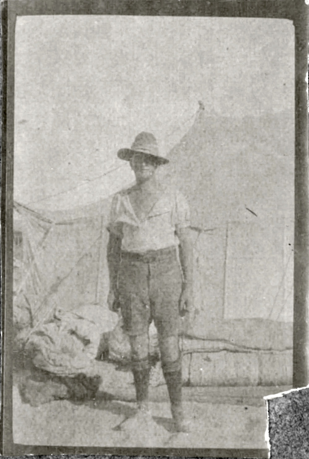 Reference NumberPhoto 14-0254DescriptionFrom the family album belonging to veteran Lance Corporal Andrew Patrick Hughes. Andrew outside pitched tent. FormatPrintSource of AcquisitionFrank Hughes (Son to Andrew Hughes)