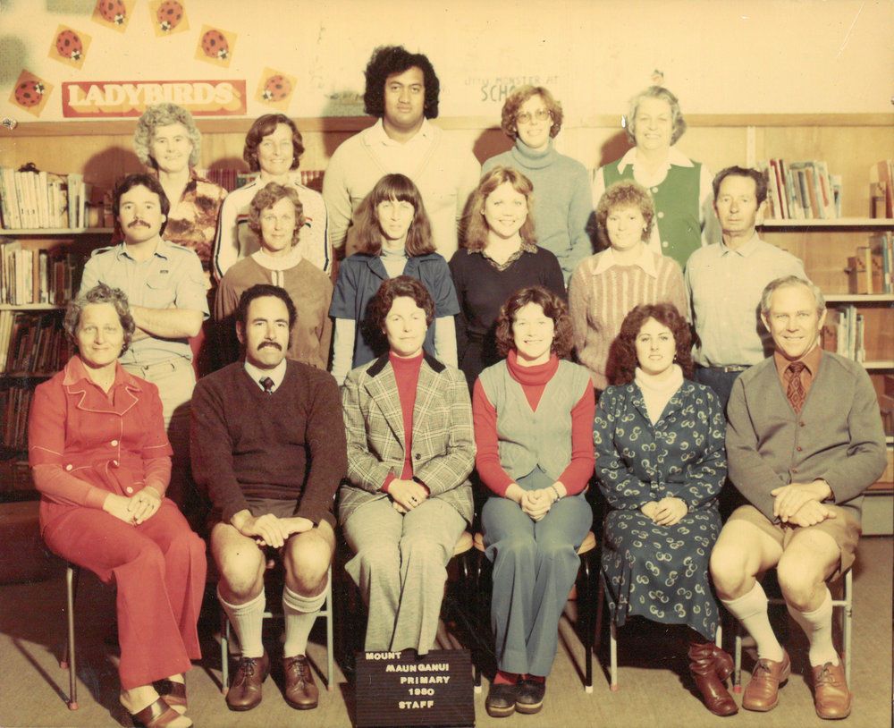 Date1980Reference NumberPhoto 13-1112DescriptionPhotograph of Mount Maunganui Primary School staff 1980. From images collected during centenary celebrations 2013. FormatPrint