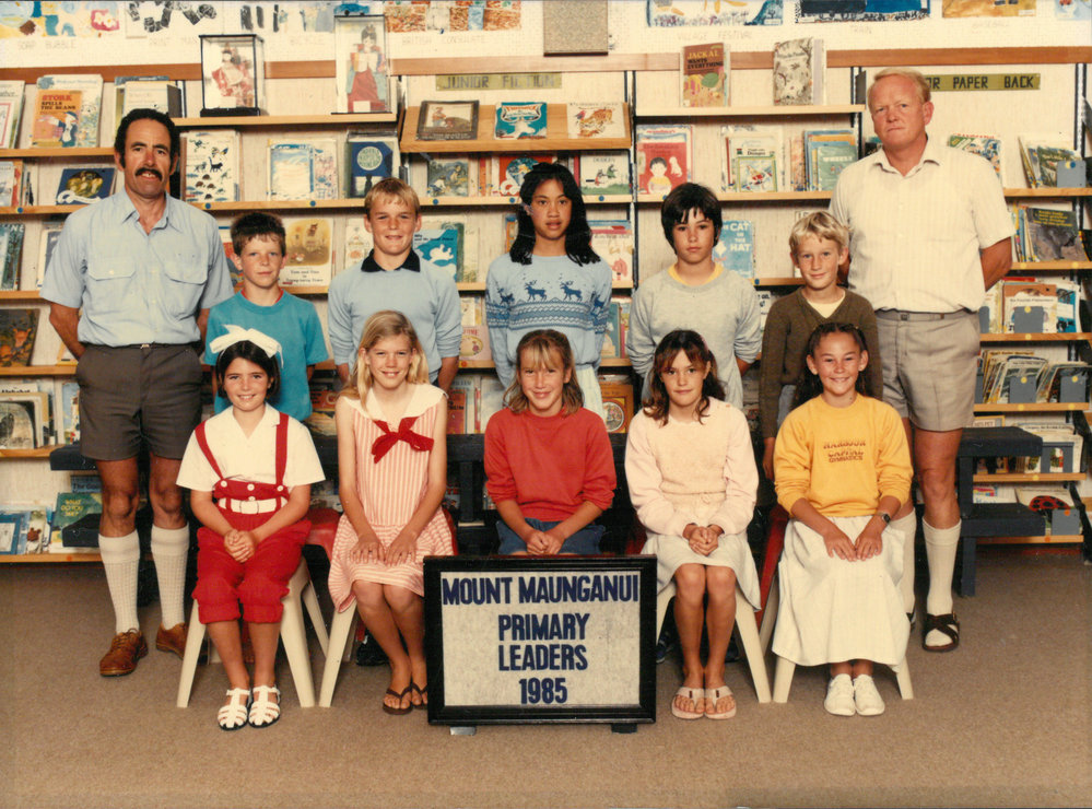 Date1985Reference NumberPhoto 13-1266DescriptionPhotograph of Mount Maunganui Primary School leaders 1985. From images collected during centenary celebrations 2013. FormatPrint