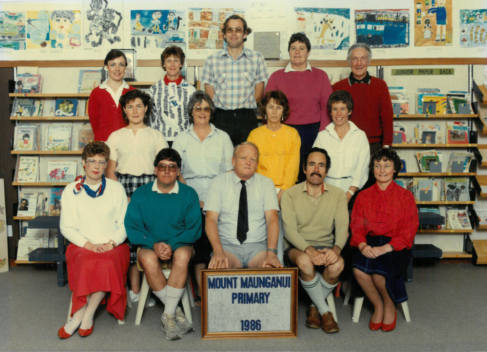 Date1986Reference NumberPhoto 13-1271DescriptionPhotograph of Mount Maunganui Primary School staff 1986. From images collected during centenary celebrations 2013. FormatPrint