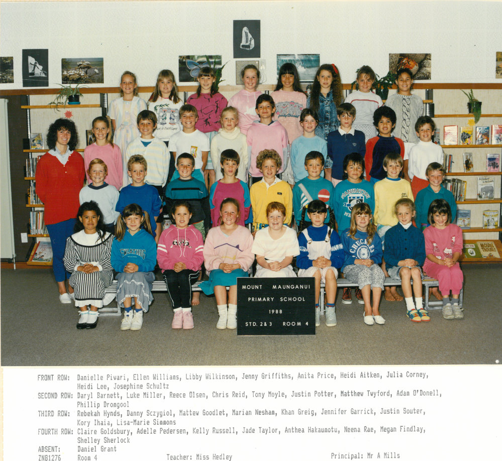 Date1988Reference NumberPhoto 13-450DescriptionPhotograph of Mount Maunganui Primary School Room 4 1988. From images collected during centenary celebrations 2013. Front Row: Danielle Piwari - Ellen Williams - Libby Wilkinson - Jenny Griffiths - Anita Price - Heidi Aitken - Julia Corney - Heidi Lee - Josephine SchultzSecond ROw: Daryl Barnett - Luke Miller - Reece Olsen - CHris Reid - Tony Moyle - Justin Potter - Matthew Twyford - Adam O'Donnell - Phillip DromgoolThird Row: Rebekah Hynds - Danny Sczygiol - Matthew Goodlet - Marian Nasham - Khan Greig - Jennifer Garrick - Justin Souter - Kory Ihaia - Lia-Marie SimmonsFourth ROw: Claire Goldsbury - Adelle Pedersen - Kelly Russell - Jade Taylor - Anthea Hakaumotu - Neena Rae - Megan Findlay - Shelley SherlockAbsent: Daniel GrantTeacher: Miss HedleyPhotograph of Mount Maunganui Primary School Room 4 1988. From images collected during centenary celebrations 2013. Front Row: Danielle Piwari - Ellen Williams - Libby Wilkinson - Jenny Griffiths - Anita Price - Heidi Aitken - Julia Corney - Heidi Lee - Josephine SchultzSecond ROw: Daryl Barnett - Luke Miller - Reece Olsen - CHris Reid - Tony Moyle - Justin Potter - Matthew Twyford - Adam O'Donnell - Phillip DromgoolThird Row: Rebekah Hynds - Danny Sczygiol - Matthew Goodlet - Marian Nasham - Khan Greig - Jennifer Garrick - Justin Souter - Kory Ihaia - Lia-Marie SimmonsFourth ROw: Claire Goldsbury - Adelle Pedersen - Kelly Russell - Jade Taylor - Anthea Hakaumotu - Neena Rae - Megan Findlay - Shelley SherlockAbsent: Daniel GrantTeacher: Miss HedleyFormatPrint