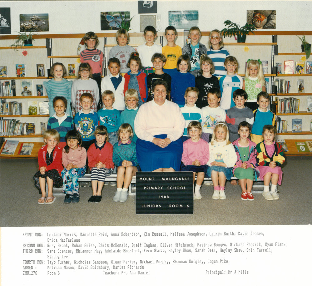 Date1988Reference NumberPhoto 13-462DescriptionPhotograph of Mount Maunganui Primary School Room 6 1988. From images collected during centenary celebrations 2013. Front Row: Leilani Morris - Danielle Reid - Anna Robertson - Kim Russell - Melissa Josephson - Lauren SMith - Katie Jensen - Erica MacFarlaneSecond Row: Rory Grant - Rohan Guise - Chris McDonald - Brett Ingham - Oliver Hitchcock - Matthew Bougen - Richard Papzrik - Ryan Plank Third Row: Sara Spencer - Rhiannon Hay - Adelaide Sherlock - Fern Stott - Hayley Shaw - Sarah Bear - Erin Farrell - Stacey LeeFourth Row: Tayo Turner - Nicholas Sampson - Glenn Parker - Michael Murphy - Shannan Quigley - Logan PikeTeahcer: Mrs Ann DanielPhotograph of Mount Maunganui Primary School Room 6 1988. From images collected during centenary celebrations 2013. Front Row: Leilani Morris - Danielle Reid - Anna Robertson - Kim Russell - Melissa Josephson - Lauren SMith - Katie Jensen - Erica MacFarlaneSecond Row: Rory Grant - Rohan Guise - Chris McDonald - Brett Ingham - Oliver Hitchcock - Matthew Bougen - Richard Papzrik - Ryan Plank Third Row: Sara Spencer - Rhiannon Hay - Adelaide Sherlock - Fern Stott - Hayley Shaw - Sarah Bear - Erin Farrell - Stacey LeeFourth Row: Tayo Turner - Nicholas Sampson - Glenn Parker - Michael Murphy - Shannan Quigley - Logan PikeTeahcer: Mrs Ann DanielFormatPrint