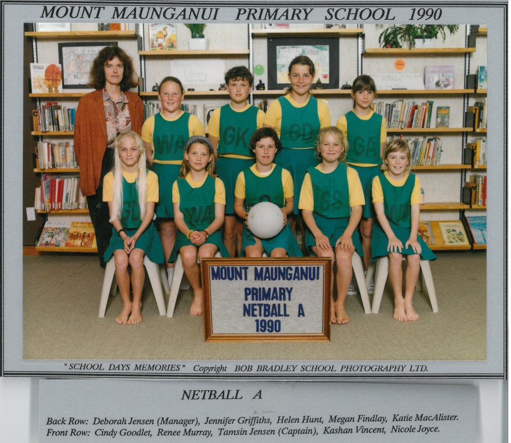 Date1990Reference NumberPhoto 13-430DescriptionPhotograph of Mount Maunganui Primary School Netball A 1990. From images collected during centenary celebrations 2013. Back Row: Deborah Jensen (Manager) - Jennifer Griffiths - Helen Hunt - Megan Findlay - Katie MacAlisterFront Row: Cindy Goodlet - Renee Murray - Tamsin Jensen (Captain) - Kashan Vincent - Nicole JoycePhotograph of Mount Maunganui Primary School Netball A 1990. From images collected during centenary celebrations 2013. Back Row: Deborah Jensen (Manager) - Jennifer Griffiths - Helen Hunt - Megan Findlay - Katie MacAlisterFront Row: Cindy Goodlet - Renee Murray - Tamsin Jensen (Captain) - Kashan Vincent - Nicole JoyceFormatPrint