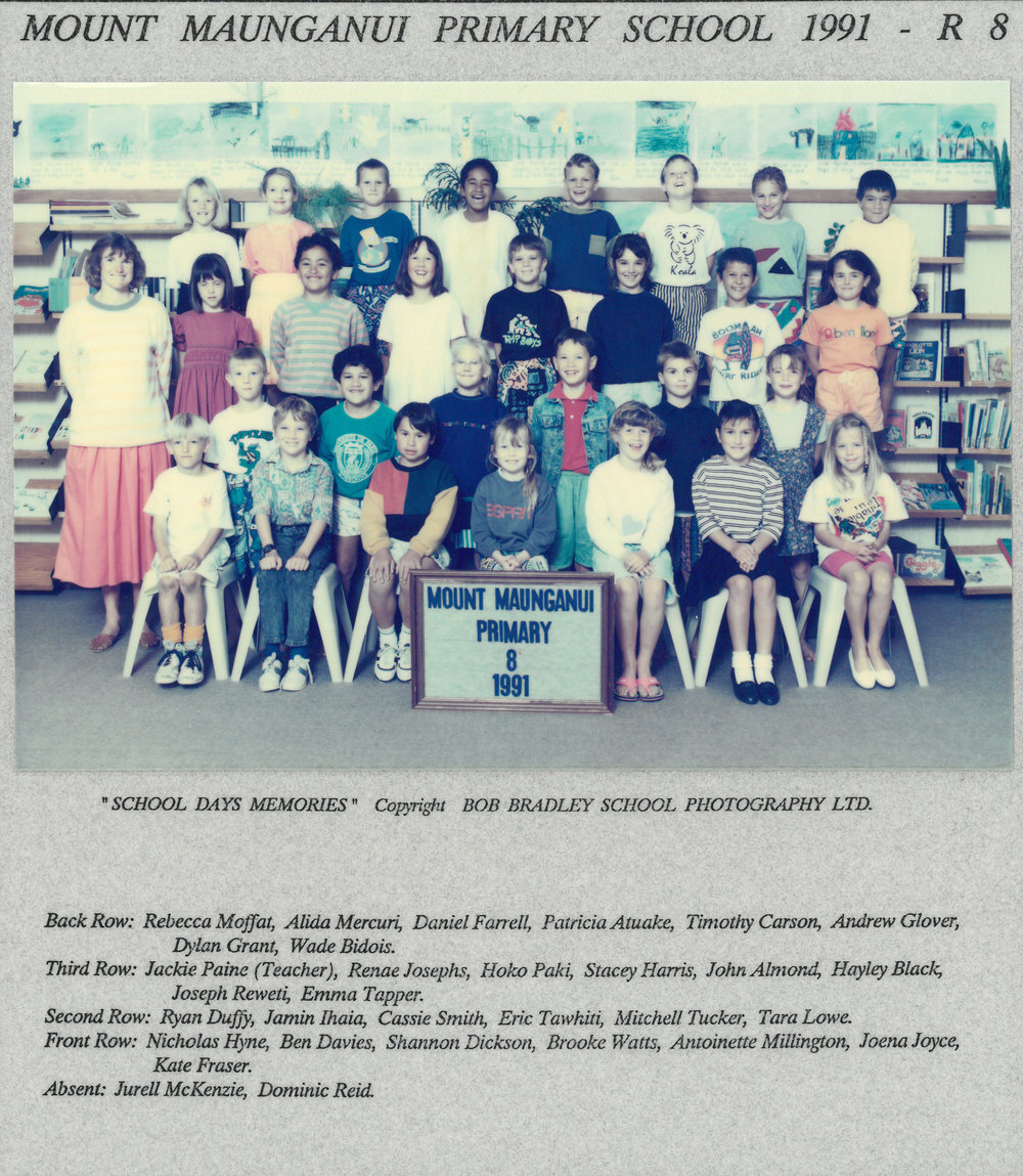 Date1991Reference NumberPhoto 13-1298DescriptionPhotograph of Mount Maunganui Primary School room 8 1991. From images collected during centenary celebrations 2013. Back row: Rebecca Moffat - Alida Mercuri - Daniel Farrell - Patricia Atuake - Timothy Carson - Andrew Glover - Dylan Grant - Wade BidoisThird row: Jackie Payne (teahcer) - Renae Josephs - Hoko Paki - Stacey Harris - John Almond - Hayley Black - Joseph Rewiti - Emma TapperSecond row: Ryan Duffy - Jamin Ihaia - Cassie Smith - Eric Tawhiti - Mitchell Tucker - Tara LoweFront row: Nicholas Hyne - Ben Davies - Shannon Dickson - Brooke Watts Antoinette Millingotn - Joena Joyce - Kate FraserAbsent: Jurell McKenzie - Dominic Reid Photograph of Mount Maunganui Primary School room 8 1991. From images collected during centenary celebrations 2013. Back row: Rebecca Moffat - Alida Mercuri - Daniel Farrell - Patricia Atuake - Timothy Carson - Andrew Glover - Dylan Grant - Wade BidoisThird row: Jackie Payne (teahcer) - Renae Josephs - Hoko Paki - Stacey Harris - John Almond - Hayley Black - Joseph Rewiti - Emma TapperSecond row: Ryan Duffy - Jamin Ihaia - Cassie Smith - Eric Tawhiti - Mitchell Tucker - Tara LoweFront row: Nicholas Hyne - Ben Davies - Shannon Dickson - Brooke Watts Antoinette Millingotn - Joena Joyce - Kate FraserAbsent: Jurell McKenzie - Dominic Reid FormatPrint