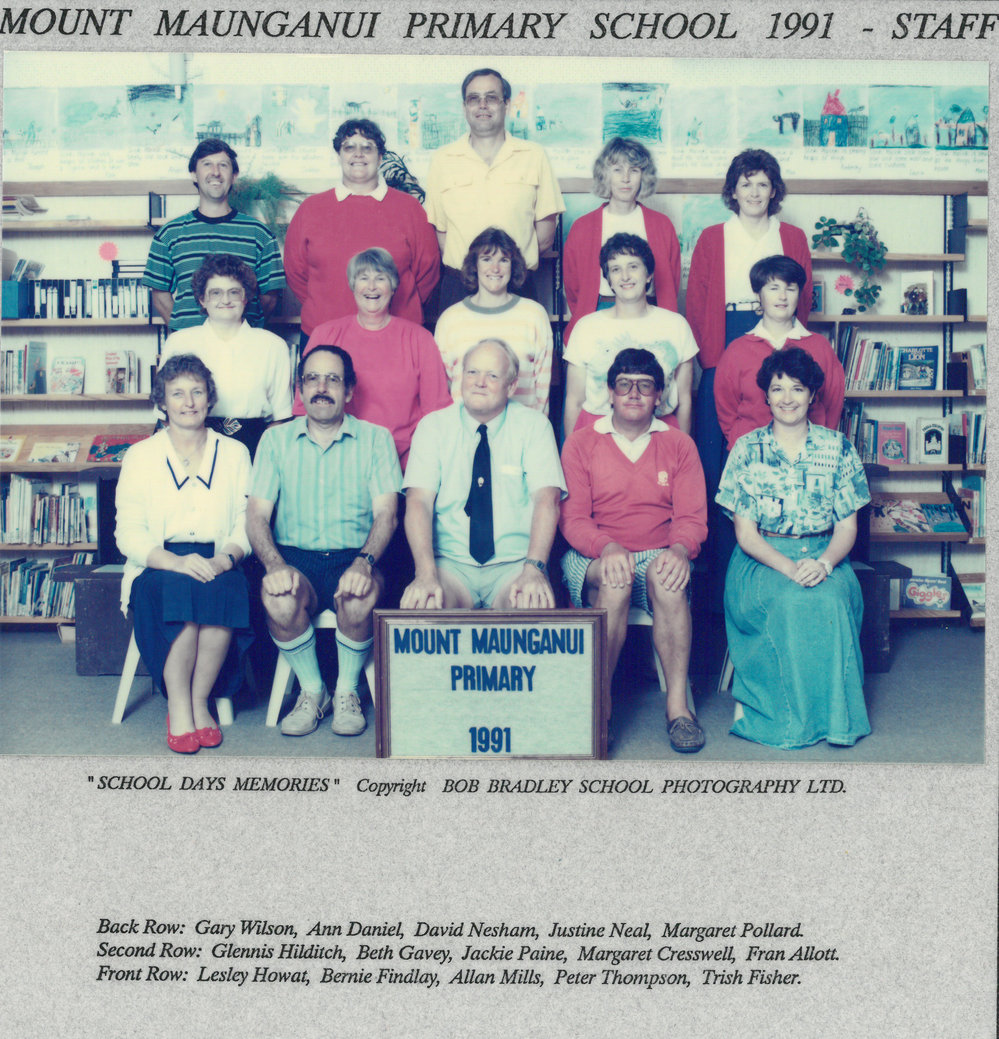Date1991Reference NumberPhoto 13-1308DescriptionPhotograph of Mount Maunganui Primary School staff 1991. From images collected during centenary celebrations 2013. Back row: Gary Wilson - Ann Daniel - David Nesham - Justine Neal - Margaret PollardSecond row: Glennis Hilditch - Beth Gavey - Jackie Paine - Margaret Cresswell - Fran AllottFront row: Lesley Howat - Bernie Findlay - Allan Mills - Peter Thompson - Trish FisherPhotograph of Mount Maunganui Primary School staff 1991. From images collected during centenary celebrations 2013. Back row: Gary Wilson - Ann Daniel - David Nesham - Justine Neal - Margaret PollardSecond row: Glennis Hilditch - Beth Gavey - Jackie Paine - Margaret Cresswell - Fran AllottFront row: Lesley Howat - Bernie Findlay - Allan Mills - Peter Thompson - Trish FisherFormatPrint