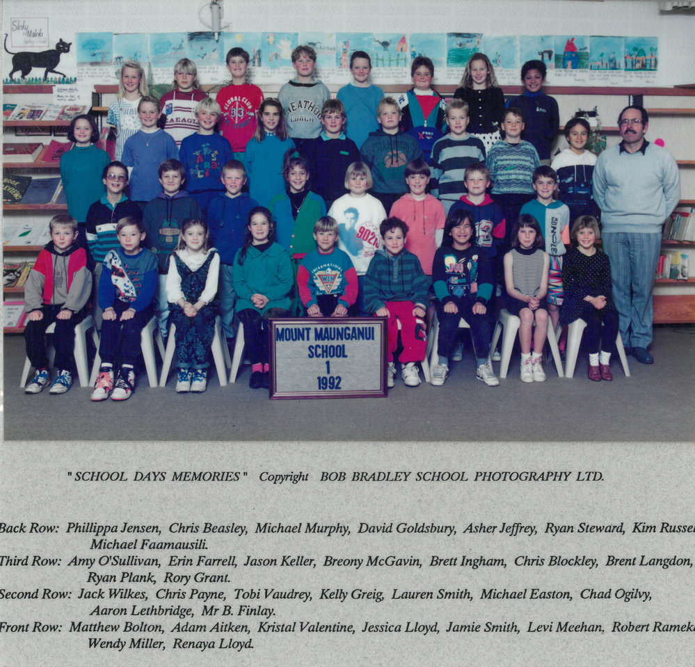 Date1992Reference NumberPhoto 13-1281DescriptionPhotograph of Mount Maunganui Primary School room 1 1992. From images collected during centenary celebrations 2013. Back row: Phillippa Jensen - Chris Beasley - Michael Murphy - David Goldsbury- Asher Jeffrey - Ryan Steward - Kim Russell - Michael FaamausiliThird row: Amy O'Sullivan - Erin Farrell - Jason Keller - Breony McGavin - Brett Ingham - Chris Blockley - Brent Langdon - Ryan Plank - Rory GrantSecond row: Jack Wilkes - Chris Payne - Tobi Vaudrey - Kelly Grieg - Lauren Smith - Michael Easton - Chad Ogilvy - Aaron Lethbridge - Mr B FindlayFront row: Matthew Bolton - Adam Aitken - Kristal Valentine - Jessica Lloyd - Jamie Smith - Levi Meehan - Robert Rāmeka - Wendy Miller - Renaya LloydPhotograph of Mount Maunganui Primary School room 1 1992. From images collected during centenary celebrations 2013. Back row: Phillippa Jensen - Chris Beasley - Michael Murphy - David Goldsbury- Asher Jeffrey - Ryan Steward - Kim Russell - Michael FaamausiliThird row: Amy O'Sullivan - Erin Farrell - Jason Keller - Breony McGavin - Brett Ingham - Chris Blockley - Brent Langdon - Ryan Plank - Rory GrantSecond row: Jack Wilkes - Chris Payne - Tobi Vaudrey - Kelly Grieg - Lauren Smith - Michael Easton - Chad Ogilvy - Aaron Lethbridge - Mr B FindlayFront row: Matthew Bolton - Adam Aitken - Kristal Valentine - Jessica Lloyd - Jamie Smith - Levi Meehan - Robert Rāmeka - Wendy Miller - Renaya LloydFormatPrint