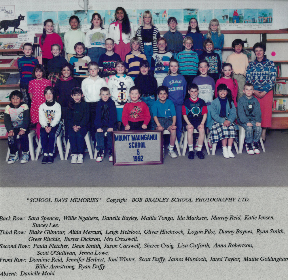 Date1992Reference NumberPhoto 13-1291DescriptionPhotograph of Mount Maunganui Primary School room 5 1992. From images collected during centenary celebrations 2013. Back row: Sara Spencer - Willie Ngahere - Danelle Bayley - Matilda Tonga - Ida Marksen - Murray Reid - Katie Jensen - Stacey LeeThird row: Blake Gilmour - Alsida Mercuri - Leigh Helsloot - Oliver Hitchcock - Logan Pike - Danny Baynes - Ryan Smith - Greer Ritchie - Buster Dickson - Mrs CresswellSecond row: Paula FLetcher - Dean Smith - Jason Carswell - Sheree Craig - Lisa Cutforth - Anna Robertson - Scott O'Sullivan - Jenna LoweFront row: Dominic Reid - Jennifer Herbert - Joni Winter - Scott Duffy - Janes Murdoch - Jared Taylor - Mattie Goldingham - Billie Armstrong - Ryan DuffyAbsent: Danielle MohiPhotograph of Mount Maunganui Primary School room 5 1992. From images collected during centenary celebrations 2013. Back row: Sara Spencer - Willie Ngahere - Danelle Bayley - Matilda Tonga - Ida Marksen - Murray Reid - Katie Jensen - Stacey LeeThird row: Blake Gilmour - Alsida Mercuri - Leigh Helsloot - Oliver Hitchcock - Logan Pike - Danny Baynes - Ryan Smith - Greer Ritchie - Buster Dickson - Mrs CresswellSecond row: Paula FLetcher - Dean Smith - Jason Carswell - Sheree Craig - Lisa Cutforth - Anna Robertson - Scott O'Sullivan - Jenna LoweFront row: Dominic Reid - Jennifer Herbert - Joni Winter - Scott Duffy - Janes Murdoch - Jared Taylor - Mattie Goldingham - Billie Armstrong - Ryan DuffyAbsent: Danielle MohiFormatPrint