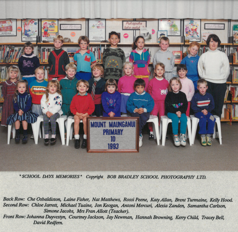 Date1993Reference NumberPhoto 13-1302DescriptionPhotograph of Mount Maunganui Primary School room 10 1993. From images collected during centenary celebrations 2013. Back row: Che Osbaldiston - Laine Fisher - Nat Matthews - Rossi Peene - Katy Allan - Brent Turmaine - Kelly Hood Second row: Chloe Jarrett - Michael Tuaine - Jon Keogan - Antoni Mercuri - Alexia Zanden - Samantha Carlson - Simone Jacobs - Mrs Fran Allott (teahcer)Front row: Johanna Duyvestyn - Courtney Jackson - Jay Newman - Hannah Browning - Kerry Child - Tracey Bell - David RedfernPhotograph of Mount Maunganui Primary School room 10 1993. From images collected during centenary celebrations 2013. Back row: Che Osbaldiston - Laine Fisher - Nat Matthews - Rossi Peene - Katy Allan - Brent Turmaine - Kelly Hood Second row: Chloe Jarrett - Michael Tuaine - Jon Keogan - Antoni Mercuri - Alexia Zanden - Samantha Carlson - Simone Jacobs - Mrs Fran Allott (teahcer)Front row: Johanna Duyvestyn - Courtney Jackson - Jay Newman - Hannah Browning - Kerry Child - Tracey Bell - David RedfernFormatPrint