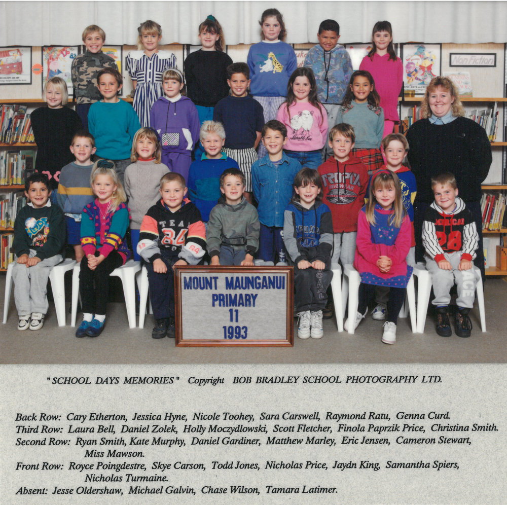 Date1993Reference NumberPhoto 13-1305DescriptionPhotograph of Mount Maunganui Primary School room 11 1993. From images collected during centenary celebrations 2013. Back row: Cary Ehterton - Jessica Hyne- Nicole Toohey - Sara Carswell - Raymond Ratu - Genna CurdThird row: Laura Bell - Daniel Zolek - Holly Moczydlowski - Scott Fletcher - Finola Paprzik Price - Christina Smith Second row: Ryan Smith - Kate Murphy - Daniel Gardiner - Matthew Marley - Eric Jensen - Cameron Stewart - Miss MawsonFront row: Royce Poingdestre - Skye Carson - Todd Jones - Nicholas Price - Jadyn King - Samantha Spiers - Nicholas TurmaineAbsent: Jesse Oldershaw - Michael Galvin - Chase Wilson - Tamara LatimerPhotograph of Mount Maunganui Primary School room 11 1993. From images collected during centenary celebrations 2013. Back row: Cary Ehterton - Jessica Hyne- Nicole Toohey - Sara Carswell - Raymond Ratu - Genna CurdThird row: Laura Bell - Daniel Zolek - Holly Moczydlowski - Scott Fletcher - Finola Paprzik Price - Christina Smith Second row: Ryan Smith - Kate Murphy - Daniel Gardiner - Matthew Marley - Eric Jensen - Cameron Stewart - Miss MawsonFront row: Royce Poingdestre - Skye Carson - Todd Jones - Nicholas Price - Jadyn King - Samantha Spiers - Nicholas TurmaineAbsent: Jesse Oldershaw - Michael Galvin - Chase Wilson - Tamara LatimerFormatPrint