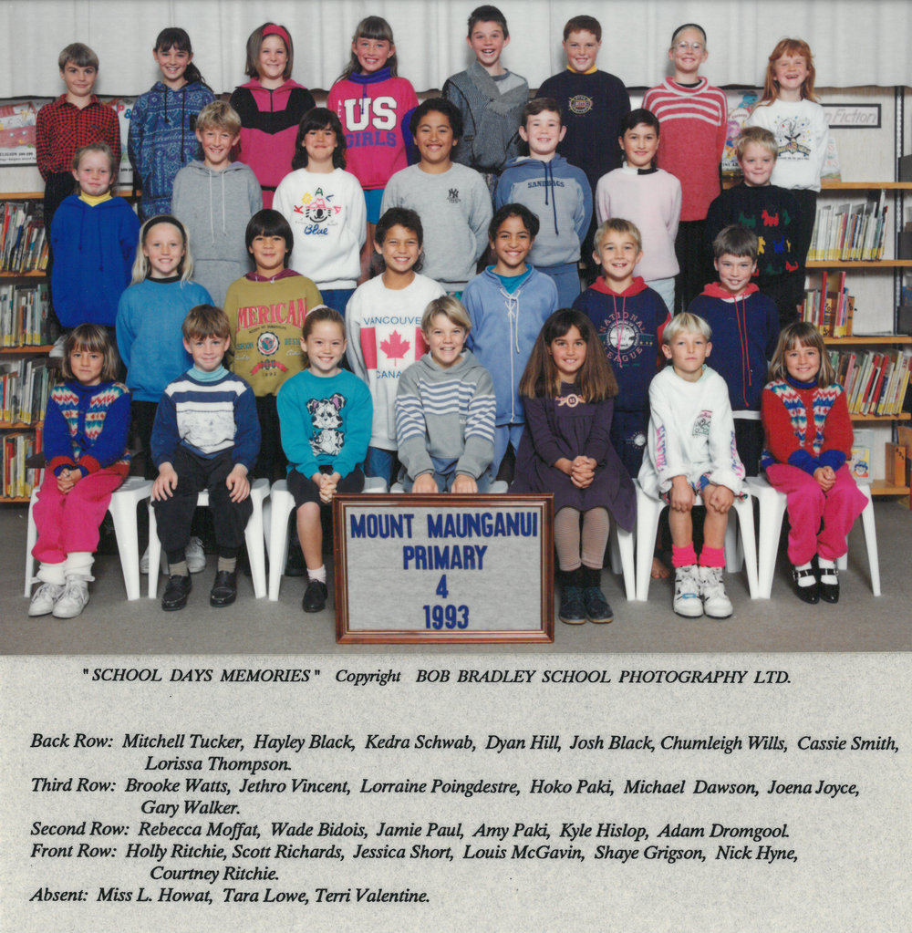Date1993Reference NumberPhoto 13-1289DescriptionPhotograph of Mount Maunganui Primary School room 4 1993. From images collected during centenary celebrations 2013. Back row: Mitchell Tucker - Hayley Black - Kedra Schwab - Dyan Hill - Josh Black - Chumleigh Wills - Cassie Smith - Lorissa ThompsonThird row: Brooke Watts - Jethro Vincent - Lorraine Poingdestre - Hoko Paki - Michael Dawson - Joena Joyce - Gary WalkerSeond row: Rebecca Moffat - Wade Bidois - Jamie Paul - Amy Paki - Kyle Hislop - Adam DromgoolFront row: Holly Ritchie - Scott Richards - Jessica Short - Louis McGavin - Shaye Grigson - Nick Hyne - Courtney RitchieAbsent: Miss L Howat - Tara Lowe - Terri ValentinePhotograph of Mount Maunganui Primary School room 4 1993. From images collected during centenary celebrations 2013. Back row: Mitchell Tucker - Hayley Black - Kedra Schwab - Dyan Hill - Josh Black - Chumleigh Wills - Cassie Smith - Lorissa ThompsonThird row: Brooke Watts - Jethro Vincent - Lorraine Poingdestre - Hoko Paki - Michael Dawson - Joena Joyce - Gary WalkerSeond row: Rebecca Moffat - Wade Bidois - Jamie Paul - Amy Paki - Kyle Hislop - Adam DromgoolFront row: Holly Ritchie - Scott Richards - Jessica Short - Louis McGavin - Shaye Grigson - Nick Hyne - Courtney RitchieAbsent: Miss L Howat - Tara Lowe - Terri ValentineFormatPrint