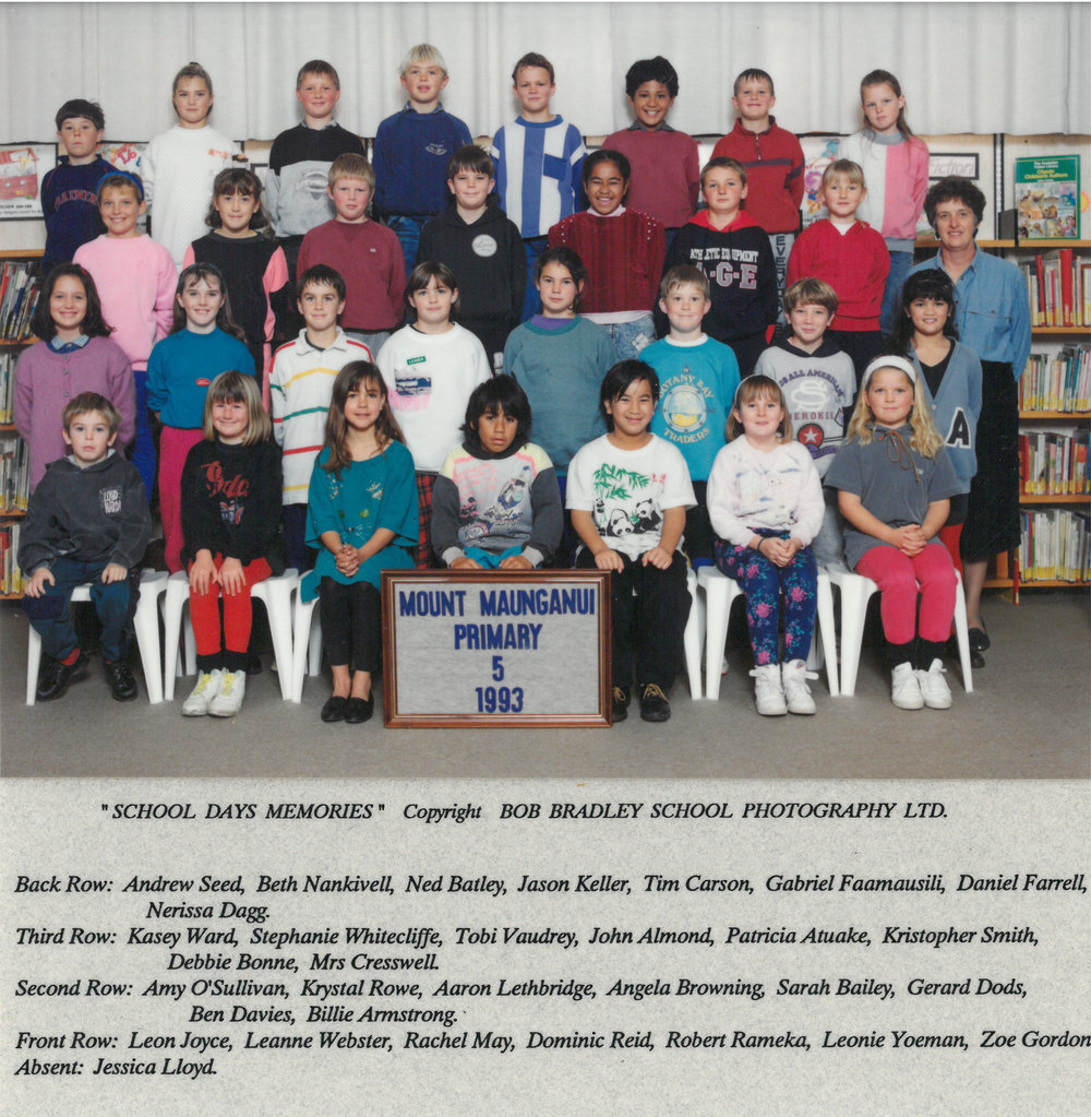 Date1993Reference NumberPhoto 13-1292DescriptionPhotograph of Mount Maunganui Primary School room 5 1993. From images collected during centenary celebrations 2013. Back row: Andrew Seed - Beth Nankivell - Ned Batley - Jason Keller - Tim Carson - Gabriel Faamausili - Daniel Farrell - Nerissa DaggThird row: Kasey Ward- Stephanie Whitecliffe - Tobi Vaudrey - John ALmond- Patricia Atuake - Kristopher Smith - Debbie Bonne - Mrs CresswellSecond row: Amy O'Sullivan - Krystal Row - Aaron Lethbridge - Angela Brwoning - Sarah Bailey - Gerard Dods - Ben Davies - Billie ArmstrongFront row: Leon Joyce - Leanne Webster - Rachel May - Dominic Reid - Robert Rāmeka - Leonie Yoeman - Zoe GordonAbsent: Jessica LloydPhotograph of Mount Maunganui Primary School room 5 1993. From images collected during centenary celebrations 2013. Back row: Andrew Seed - Beth Nankivell - Ned Batley - Jason Keller - Tim Carson - Gabriel Faamausili - Daniel Farrell - Nerissa DaggThird row: Kasey Ward- Stephanie Whitecliffe - Tobi Vaudrey - John ALmond- Patricia Atuake - Kristopher Smith - Debbie Bonne - Mrs CresswellSecond row: Amy O'Sullivan - Krystal Row - Aaron Lethbridge - Angela Brwoning - Sarah Bailey - Gerard Dods - Ben Davies - Billie ArmstrongFront row: Leon Joyce - Leanne Webster - Rachel May - Dominic Reid - Robert Rāmeka - Leonie Yoeman - Zoe GordonAbsent: Jessica LloydFormatPrint