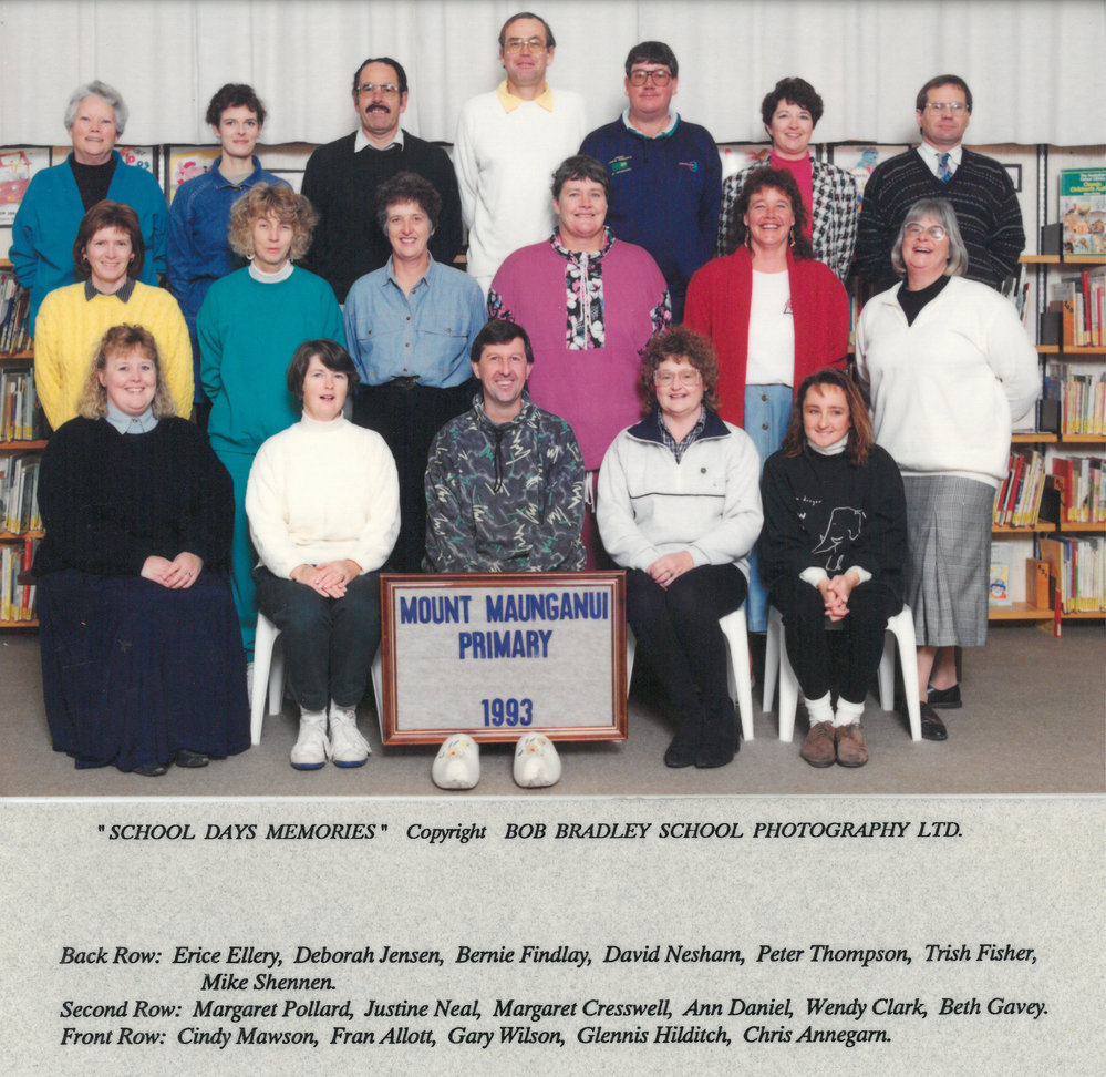 Date1993Reference NumberPhoto 13-1310DescriptionPhotograph of Mount Maunganui Primary School staff 1993. From images collected during centenary celebrations 2013. Back row: Erice Ellery - Deborah Jensen - Bernie Findlay - David Nesham - Peter Thompson - Trish Fisher - Mike ShennenSecond row: Margaret Pollard - Justine Neal - Margaret Cresswell - Ann Daniel - Wendy Clark - Beth GaveyFront row: Cindy Mawson - Fran Allott - Gary Wilson - Glennis Hilditch - Chirs AnnegarnPhotograph of Mount Maunganui Primary School staff 1993. From images collected during centenary celebrations 2013. Back row: Erice Ellery - Deborah Jensen - Bernie Findlay - David Nesham - Peter Thompson - Trish Fisher - Mike ShennenSecond row: Margaret Pollard - Justine Neal - Margaret Cresswell - Ann Daniel - Wendy Clark - Beth GaveyFront row: Cindy Mawson - Fran Allott - Gary Wilson - Glennis Hilditch - Chirs AnnegarnFormatPrint