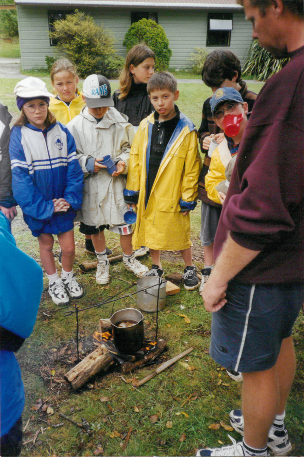 Date1994Reference NumberPhoto 13-1181DescriptionPhotograph of Mount Maunganui Primary School making billy tea with Kim Buchan at Aongatete camp 1994. Courtney Jackson in blue coat - Cody Len in yellow. From images collected during centenary celebrations 2013. FormatPrint