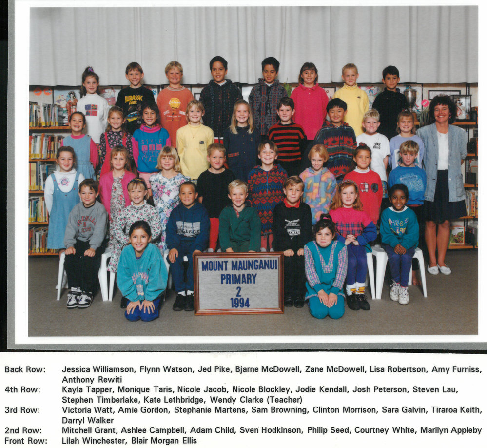 Date1994Reference NumberPhoto 13-440DescriptionPhotograph of Mount Maunganui School Room 2 1994. From images collected during Centenary celebration 2013. Back Row: Jessica Williamson - Flynn Watson - Jed Pike - Bjarne McDowell - Zane McDowell - Lisa Robertson - Amy Furniss - Anthiny Rewiti4th: Kayla Tapper - Monique Taris - Nicole Jacob - Nicole Blockley - Jodie Kendall - Josh Peterson - Steven Lau - Stephen Timberlake - Kate Lethbridge - Wendy Clarke (Teacher)3rd Row: Victoria Watt - Amie Gordon - Stephanie Martens - Sam Browning - Clinton Morrison - Sara Galvin - Tiraroa Keith - Darryl Walker2nd Row: Mitchell Grant - Ashlee Campbell - Adam Child - Sven Hodkinson - Philip Seed - Courtney White - Marilyn ApplebyFront Row: Lilah Winchester - Blair Morgan EllisPhotograph of Mount Maunganui School Room 2 1994. From images collected during Centenary celebration 2013. Back Row: Jessica Williamson - Flynn Watson - Jed Pike - Bjarne McDowell - Zane McDowell - Lisa Robertson - Amy Furniss - Anthiny Rewiti4th: Kayla Tapper - Monique Taris - Nicole Jacob - Nicole Blockley - Jodie Kendall - Josh Peterson - Steven Lau - Stephen Timberlake - Kate Lethbridge - Wendy Clarke (Teacher)3rd Row: Victoria Watt - Amie Gordon - Stephanie Martens - Sam Browning - Clinton Morrison - Sara Galvin - Tiraroa Keith - Darryl Walker2nd Row: Mitchell Grant - Ashlee Campbell - Adam Child - Sven Hodkinson - Philip Seed - Courtney White - Marilyn ApplebyFront Row: Lilah Winchester - Blair Morgan EllisFormatPrint