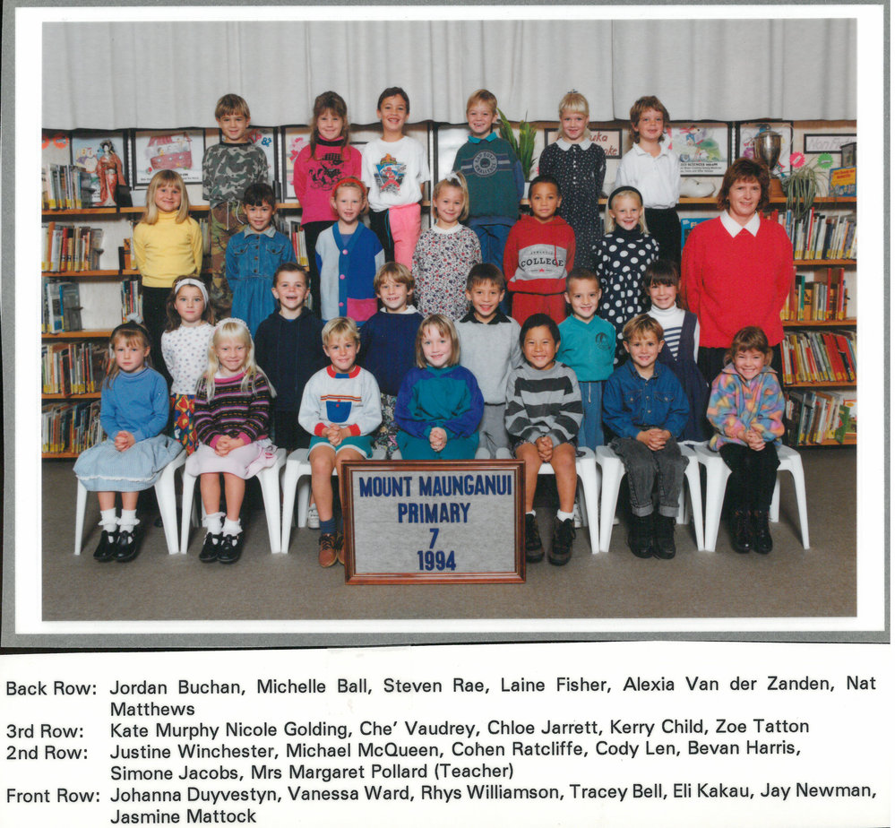 Date1994Reference NumberPhoto 13-469DescriptionMount Maunganui Primary School Room 7 1994. From images collected during Mount Maunganui Primary School Centenary 2013. Back Row: Jordan Buchan - Michelle Ball - Steven Rae - Laine Fisher - Alexia Van der Zanden - Nat Matthews3rd Row: Kate Murphy - Nicole Golding - Che - Vaudry - Chloe Jarrett - Kerry Child - Zoe Tatton 2nd Row: Justine Winchester - Michael McQueen - Cohen Ratcliffe - Cody Len - Bevan Harris - Simone Jacobs - Mrs Margaret Pollard (Teacher)Front Row: Johanna Duyvestyn - Vanessa Ward - Rhys Williamson - Tracey Bell - Eli Kakau - Jay Newman - Jasmine MattockMount Maunganui Primary School Room 7 1994. From images collected during Mount Maunganui Primary School Centenary 2013. Back Row: Jordan Buchan - Michelle Ball - Steven Rae - Laine Fisher - Alexia Van der Zanden - Nat Matthews3rd Row: Kate Murphy - Nicole Golding - Che - Vaudry - Chloe Jarrett - Kerry Child - Zoe Tatton 2nd Row: Justine Winchester - Michael McQueen - Cohen Ratcliffe - Cody Len - Bevan Harris - Simone Jacobs - Mrs Margaret Pollard (Teacher)Front Row: Johanna Duyvestyn - Vanessa Ward - Rhys Williamson - Tracey Bell - Eli Kakau - Jay Newman - Jasmine MattockFormatPrint