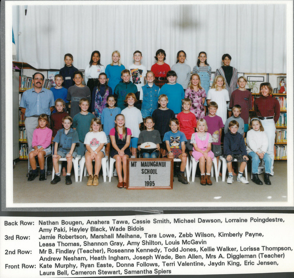 Date1995Reference NumberPhoto 13-438DescriptionPhotograph of Mount Maunganui School Room 1 1995. From images collected during Centenary celebration 2013. Back Row: Nathan Bougen - Anahera Tawa - Cassie Smith - Michael Dawson - Lorraine Poingdestre - Amy Paki - Hayley Black - Wade Bidois3rd Row: Jamie Robertson - Marshall Meihana - Tara Lowe - Zebb Wilson - Kimberly Payne - Leasa Thomas - Shannon Gray - Amy Shilton - Louis McGavin2nd Row: Mr B Finslay (Teacher) - Roseanne Kennedy - Todd Jones - Kellie Walker - Lorissa Thompson - Andrew Nesham - Heath Ingham - Joseph Wade - Ben Allen - Mrs A Diggleman (Teacher)Front Row: Kate Murphy - Ryan Easte - Donna Follows - Terri Valentine - Jaydn King - Eric Jensen - Laura Bell - Cameron Stewart - Samantha SpiersPhotograph of Mount Maunganui School Room 1 1995. From images collected during Centenary celebration 2013. Back Row: Nathan Bougen - Anahera Tawa - Cassie Smith - Michael Dawson - Lorraine Poingdestre - Amy Paki - Hayley Black - Wade Bidois3rd Row: Jamie Robertson - Marshall Meihana - Tara Lowe - Zebb Wilson - Kimberly Payne - Leasa Thomas - Shannon Gray - Amy Shilton - Louis McGavin2nd Row: Mr B Finslay (Teacher) - Roseanne Kennedy - Todd Jones - Kellie Walker - Lorissa Thompson - Andrew Nesham - Heath Ingham - Joseph Wade - Ben Allen - Mrs A Diggleman (Teacher)Front Row: Kate Murphy - Ryan Easte - Donna Follows - Terri Valentine - Jaydn King - Eric Jensen - Laura Bell - Cameron Stewart - Samantha SpiersFormatPrint