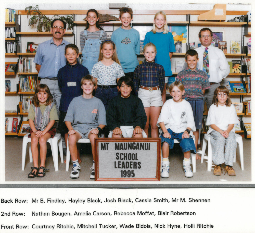 Date1995Reference NumberPhoto 13-489DescriptionPhotograph of Mount Maunganui Primary School Leaders 1995. From images collected as part of Centenary celebrations 2013. Back Row: Mr B. Findlay - Hayley - Josh Black - Cassie Smith - Mr M. Shennen2nd Row: Nathan Bougen - Amelia Carson - Rebecca Moffat - Blair Robertson Front Row: Courtney Ritchie - Mitchell Tucker - Wade Bidois - Nick Hyne - Holli RicthiePhotograph of Mount Maunganui Primary School Leaders 1995. From images collected as part of Centenary celebrations 2013. Back Row: Mr B. Findlay - Hayley - Josh Black - Cassie Smith - Mr M. Shennen2nd Row: Nathan Bougen - Amelia Carson - Rebecca Moffat - Blair Robertson Front Row: Courtney Ritchie - Mitchell Tucker - Wade Bidois - Nick Hyne - Holli RicthieFormatPrint