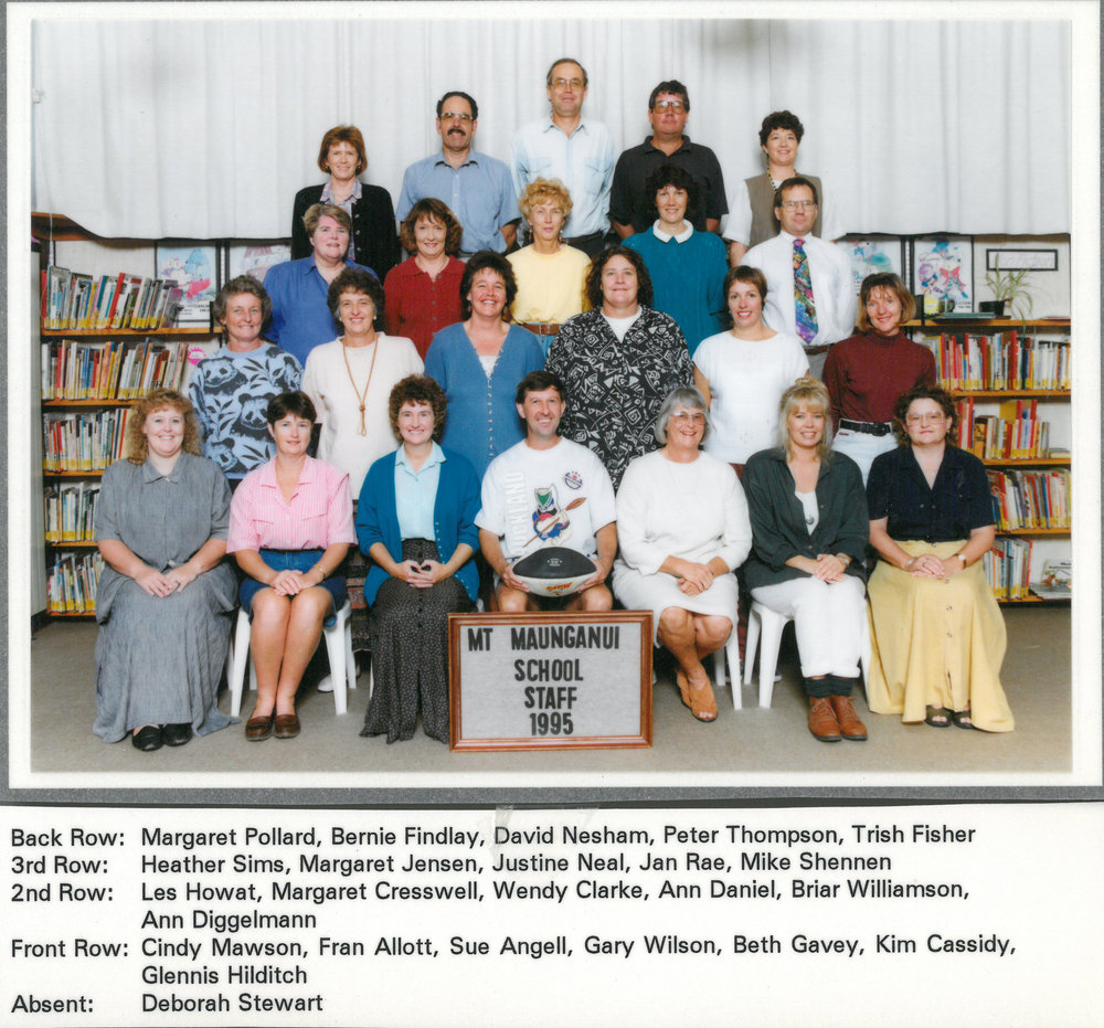Date1995Reference NumberPhoto 13-494DescriptionPhotograph of Mount Maunganui Primary School staff 1995. From images collected as part of Centenary celebrations 2013. Back Row: Marageret Pollard - Bernie Findlay - David Nesham - Peter Thompson - Trish Fisher3rd Row: Heather Sims - Margaret Jensen - Justine Neal - Jan Rae - Mike Shennen2nd Row: Les Howat - Margaret Creswell - Wendy Clarke - Ann Daniel - Briar Williamson - Ann DiggelmannFront Row: Cindy Mawson - Fran Allott - Sue ANgell - Gary Wilson - Beth Gavey - Kim Cassidy - Glennis HilditchAbsent: Deborah StewartPhotograph of Mount Maunganui Primary School staff 1995. From images collected as part of Centenary celebrations 2013. Back Row: Marageret Pollard - Bernie Findlay - David Nesham - Peter Thompson - Trish Fisher3rd Row: Heather Sims - Margaret Jensen - Justine Neal - Jan Rae - Mike Shennen2nd Row: Les Howat - Margaret Creswell - Wendy Clarke - Ann Daniel - Briar Williamson - Ann DiggelmannFront Row: Cindy Mawson - Fran Allott - Sue ANgell - Gary Wilson - Beth Gavey - Kim Cassidy - Glennis HilditchAbsent: Deborah StewartFormatPrint
