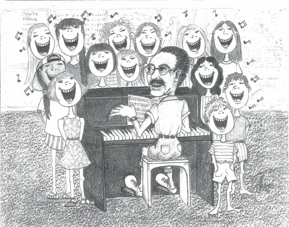 Date1996Reference NumberPhoto 13-1213DescriptionPhotocopied caricature drawn by parent Tangy Thomas of Mount Maunganui Primary School teacher Bernie Findlay and children at the piano in 1996, inspired by his always singing with the children. From images collected during centenary celebrations 2013. FormatPrint