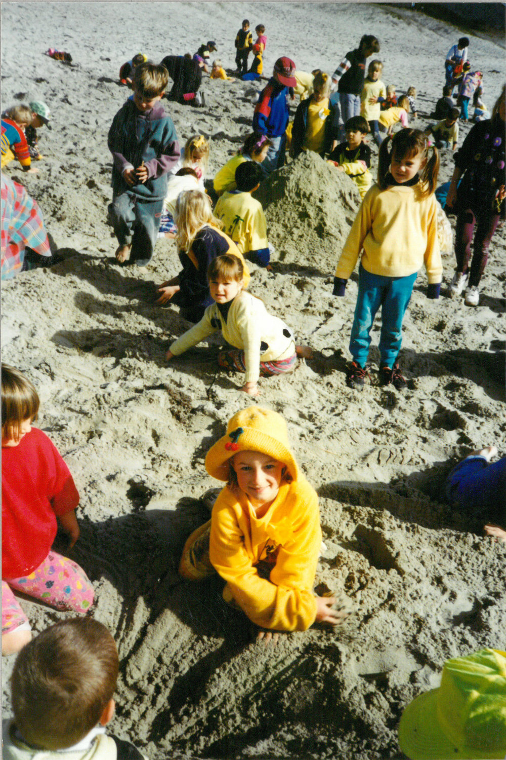 Date1996Reference NumberPhoto 13-1140DescriptionPhotograph of Mount Maunganui Primary School Daffodil Day activities fundraising for child cancer 1996. Children donated $1 entry to hunt in the sand for hidden ice-block sticks and were rewarded with a small gift of a recycled toy if they were successful. From images collected during centenary celebrations 2013. FormatPrint