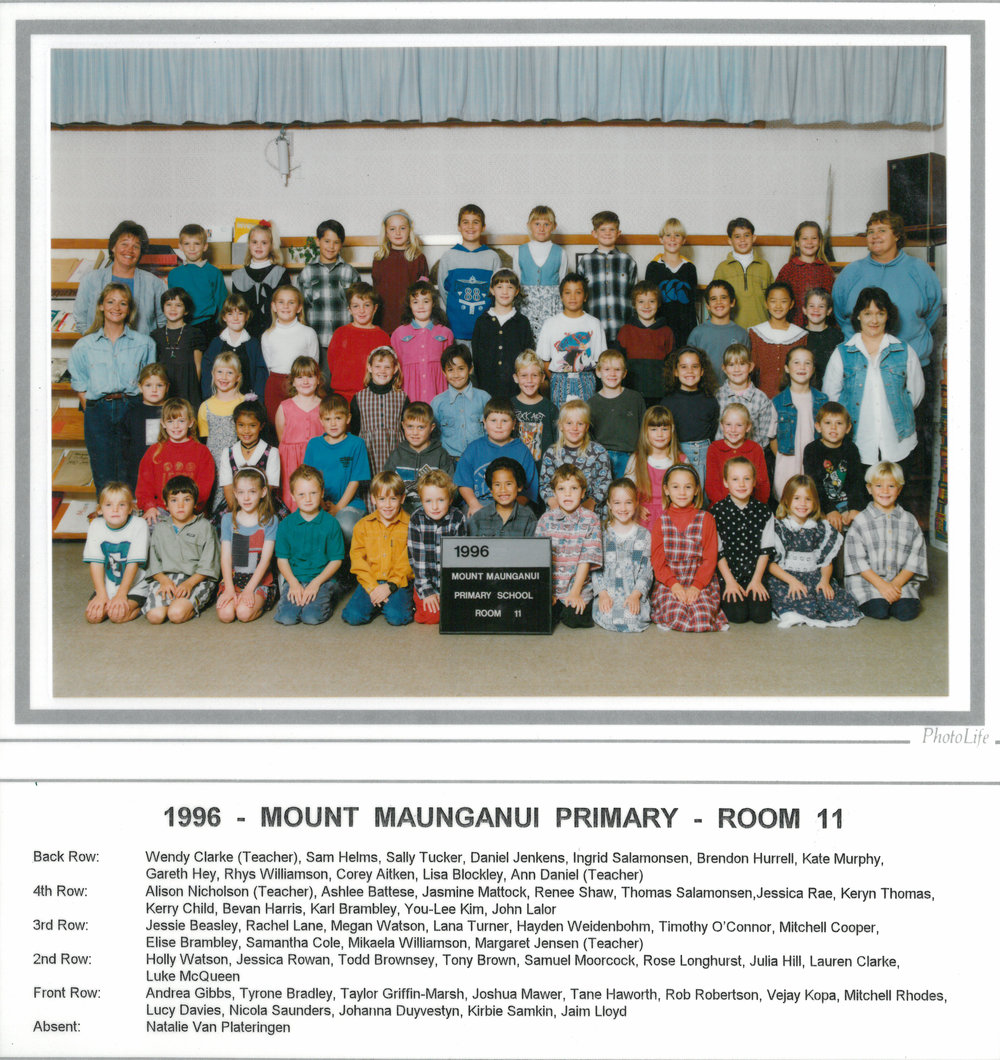 Date1996Reference NumberPhoto 13-1461DescriptionPhotograph of Mount Maunganui Primary School room 11 1996. From images collected during centenary celebrations 2013. Back row: Wendy Clarke (Teacher) - Sam Helms - Sally Tucker - Daniel Jenkins - Ingrid Salamonsen- Brendon Hurrell - Kate Murphy - Gareth Hey - Rhys Williamson - Corey Aitken - Lisa Blockley - Ann Daniel (Teacher)4th row: Alison Nicholson (Teacher) - Ashlee Battese - Jasmine Mattock - Renee Shaw - Thomas Salamonsen - Jessica Rae - Karyn Thomas - Kerry Child - Bevan Harris - Karl Brambley - You-Lee Kim - John Lalor3rd row: Jessie Beasley - Rachel Lane - Megan Watson - Lana Turner - Hayden Weidenbohm - Timothy O'Connor - Mitchell Cooper - Elise Brambley - Samantha Cole - Mikaela Williamson - Margaret Jensen (Teacher)2nd row: Holly Watson - Jessica Rowan - Todd Brownsey - Tony Brown - Samuel Moorcock - Rose Longhurst - Julia Hill - Lauren Clarke - Luke McQueenFront row: Andrea Gibbs - Tyrone Bradley - Taylor Griffin-Marsh - Joshua Mawer - Tane Haworth - Rob Robertson - Vejay Kopa - Mitchell Rhodes - Lucy Davies - Nicola Saunders - Johanna Duyvestyn - Jaim LloydAbsent: Natalie Van Plateringen FormatPrint