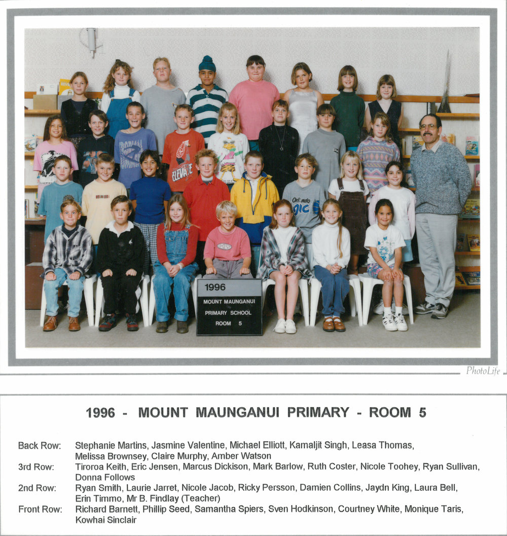 Date1996Reference NumberPhoto 13-1455DescriptionPhotograph of Mount Maunganui Primary School room 5 1996. From images collected during centenary celebrations 2013. Back row: Stephanie Martins - Jasmine Valentine - Michael Elliot - Kamaljit Singh - Leasa Thomas - Melissa Brownsey - Claire Murphy - Amber Watson3rd row: Tiroroa Keith - Eric Jensen - Marcus Dickinson - Mark Barlow - Ruth Coster - Nicole Toohey - Ryan Sullivan - Donna Follows2nd row: Ryan Smith - Laurie Jarret - Nicole Jacob - Ricky Persson - Damien Collins - Jaydn King - Laura Bell - Erin Timmo - Mr B. Findlay (Teacher)Front row: Richard Barnett - Phillip Seed - Samantha Spiers - Sven Hodkinson - Courtney White - Monique Taris - Kōwhai SinclairFormatPrint