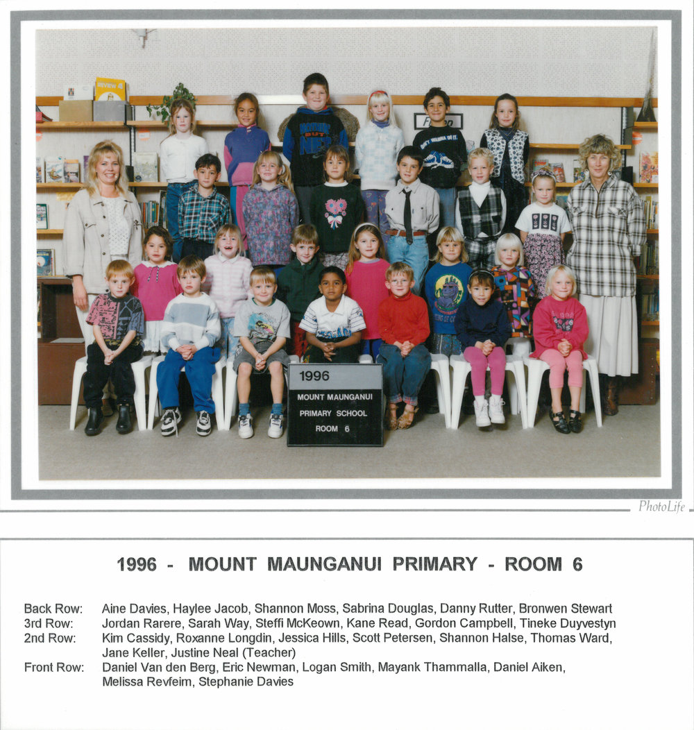 Date1996Reference NumberPhoto 13-1456DescriptionPhotograph of Mount Maunganui Primary School room 6 1996. From images collected during centenary celebrations 2013. Back row: Aine Davies - Haylee Jacob - Shannon Moss - Sabrina Douglas - Danny Rutter - Bronwyn Stewart3rd row: Jordan Rarere - Sarah Way - Steffi McKeown - Kane Reed - Gordon Campbell - Tineke Duyvestyn 2nd row: Kim Cassidy - Roxanne Longdin - Jessica Hills - Scott Petersen - Shannon Halse - Thomas Ward - Jane Keller - Justine Neal (Teacher)Front row: Daniel Van den Berg - Eric Newman - Logan Smith - Mayank Thammalla - Daniel Aiken - Melissa Revfeim - Stephanie DaviesFormatPrint