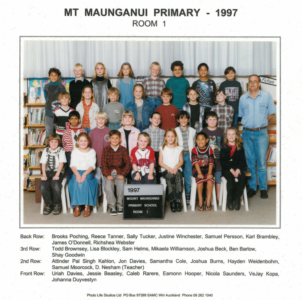 Date1997Reference NumberPhoto 13-1396DescriptionPhotograph of Mount Maunganui Primary School room 1 1997. From images collected during centenary celebrations. Row 4: Brooks Poching – Reece Tanner – Sally Tucker – Justine Winchester – Samuel Persson - Karl Brambley – James O'Donnell – Richshea WebsterRow 3: Todd Brownsey – Lisa Blockley – Sam Helms – Mikaela Williamson – Joshua Beck - Ben Barlow – Shay GoodwinRow 2: Attinder Pai Singh Kahlon – Jon Davies – Samantha Cole – Joshua Burns – Hayden Weidenbohm - Samuel Moorcock – Mr David NeshamRow 1: Uriah Davies – Jessie Beasley – Caleb Rarere – Eamonn Hooper – Nicola Saunders - VeJay Kopa – Johanna DuyvestynRow 4: Brooks Poching – Reece Tanner – Sally Tucker – Justine Winchester – Samuel Persson - Karl Brambley – James O'Donnell – Richshea WebsterRow 3: Todd Brownsey – Lisa Blockley – Sam Helms – Mikaela Williamson – Joshua Beck - Ben Barlow – Shay GoodwinRow 2: Attinder Pai Singh Kahlon – Jon Davies – Samantha Cole – Joshua Burns – Hayden Weidenbohm - Samuel Moorcock – Mr David NeshamRow 1: Uriah Davies – Jessie Beasley – Caleb Rarere – Eamonn Hooper – Nicola Saunders - VeJay Kopa – Johanna DuyvestynPhotograph of Mount Maunganui Primary School room 1 1997. From images collected during centenary celebrations. Row 4: Brooks Poching – Reece Tanner – Sally Tucker – Justine Winchester – Samuel Persson - Karl Brambley – James O'Donnell – Richshea WebsterRow 3: Todd Brownsey – Lisa Blockley – Sam Helms – Mikaela Williamson – Joshua Beck - Ben Barlow – Shay GoodwinRow 2: Attinder Pai Singh Kahlon – Jon Davies – Samantha Cole – Joshua Burns – Hayden Weidenbohm - Samuel Moorcock – Mr David NeshamRow 1: Uriah Davies – Jessie Beasley – Caleb Rarere – Eamonn Hooper – Nicola Saunders - VeJay Kopa – Johanna DuyvestynRow 4: Brooks Poching – Reece Tanner – Sally Tucker – Justine Winchester – Samuel Persson - Karl Brambley – James O'Donnell – Richshea WebsterRow 3: Todd Brownsey – Lisa Blockley – Sam Helms – Mikaela Williamson – Joshua Beck - Ben Barlow – Shay GoodwinRow 2: Attinder Pai Singh Kahlon – Jon Davies – Samantha Cole – Joshua Burns – Hayden Weidenbohm - Samuel Moorcock – Mr David NeshamRow 1: Uriah Davies – Jessie Beasley – Caleb Rarere – Eamonn Hooper – Nicola Saunders - VeJay Kopa – Johanna DuyvestynFormatPrint