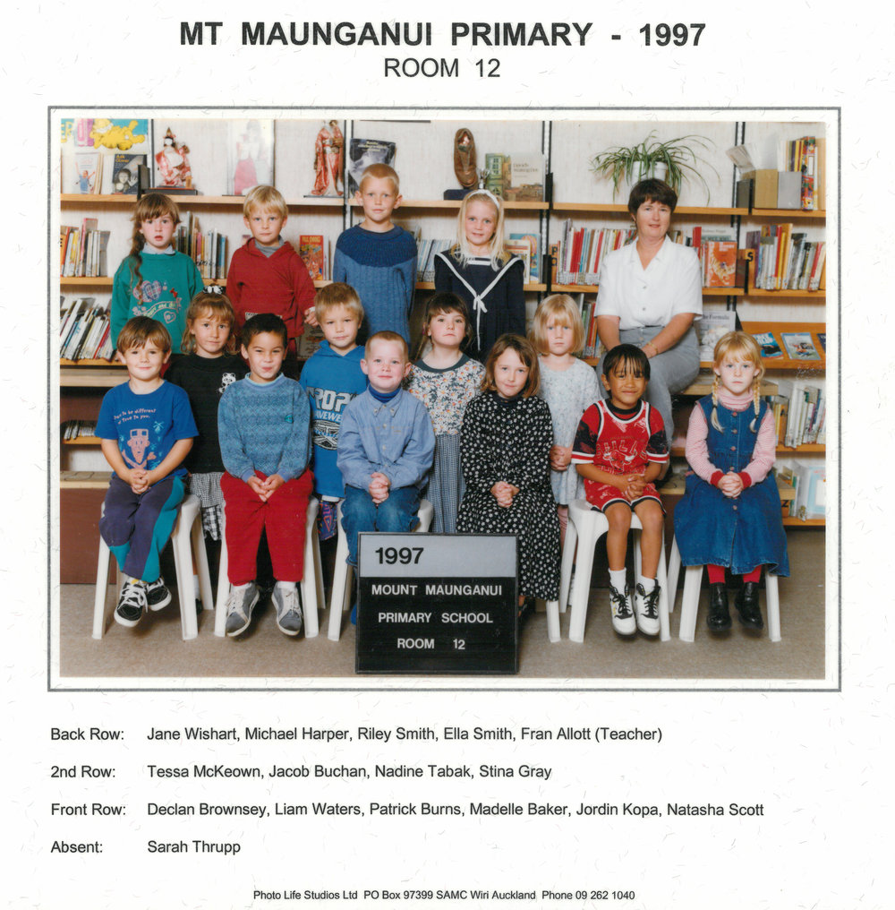 Date1997Reference NumberPhoto 13-1423DescriptionPhotograph of Mount Maunganui Primary School room 12 1997. From images collected during centenary celebrations. Row 3: Jane Wishart – Michael Harper – Riley Smith – Ella Smith – Fran AllottRow 2: Tessa McKeown – Jacob Buchan – Nadine Tabak – Stina GrayRow 1: Declan Brownsey – Liam Waters – Patrick Burns – Madelle Baker – Jordin Kopa - Natasha ScottAbsent: Sarah ThruppPhotograph of Mount Maunganui Primary School room 12 1997. From images collected during centenary celebrations. Row 3: Jane Wishart – Michael Harper – Riley Smith – Ella Smith – Fran AllottRow 2: Tessa McKeown – Jacob Buchan – Nadine Tabak – Stina GrayRow 1: Declan Brownsey – Liam Waters – Patrick Burns – Madelle Baker – Jordin Kopa - Natasha ScottAbsent: Sarah ThruppFormatPrint