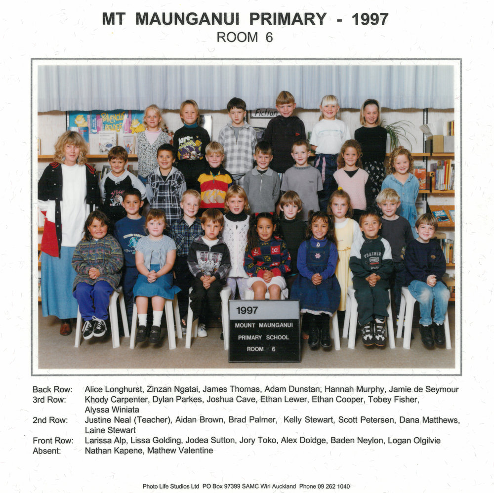 Date1997Reference NumberPhoto 13-1411DescriptionPhotograph of Mount Maunganui Primary School room 6 1997. From images collected during centenary celebrations. Row 4: Alice Longhurst – Zinzan Ngatai – James Thomas – Adam Dunstan – Hannah Murphy - Jamie de SeymourRow 3: Khody Carpenter – Dylan Parkes – Joshua Cave – Ethan Lewer – Ethan Cooper -Tobey Fisher – Alyssa WiniataRow 2: Justine Neal – Aidan Brown – Brad Palmer – Kelly Stewart – Scott Petersen – Dana Matthews - Laine StewartRow 1: Larissa Alp – Lissa Golding – Jodea Sutton – Jory Toko – Alex Doidge – Baden Neylon - Logan OlgilvieAbsent: Nathan Kapene – Mathew ValentinePhotograph of Mount Maunganui Primary School room 6 1997. From images collected during centenary celebrations. Row 4: Alice Longhurst – Zinzan Ngatai – James Thomas – Adam Dunstan – Hannah Murphy - Jamie de SeymourRow 3: Khody Carpenter – Dylan Parkes – Joshua Cave – Ethan Lewer – Ethan Cooper -Tobey Fisher – Alyssa WiniataRow 2: Justine Neal – Aidan Brown – Brad Palmer – Kelly Stewart – Scott Petersen – Dana Matthews - Laine StewartRow 1: Larissa Alp – Lissa Golding – Jodea Sutton – Jory Toko – Alex Doidge – Baden Neylon - Logan OlgilvieAbsent: Nathan Kapene – Mathew ValentineFormatPrint