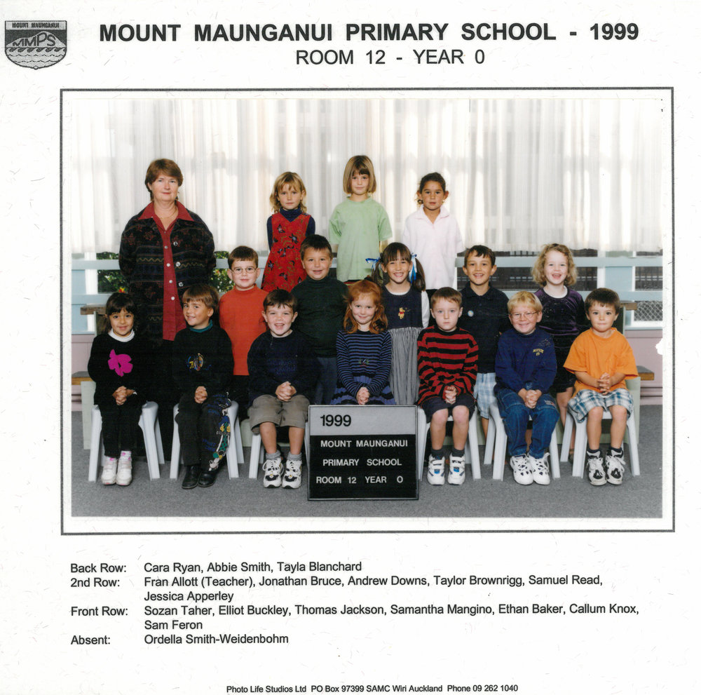 Date1999Reference NumberPhoto 13-1425DescriptionPhotograph of Mount Maunganui Primary School room 12 year 0 1999. From images collected during centenary celebrations 2013. Row 3: Cara Ryan – Abbie Smith – Tayla BlanchardRow 2: Mrs Fran Allott – Jonathan Bruce – Andrew Downs – Taylor Brownrigg – Samuel Read - Jessica ApperleyRow 1: Sozan Taher – Elliot Buckley – Thomas Jackson – Samantha Mangino – Ethan Baker - Callum Knox – Sam FeronAbsent: Ordella Smith-WeidenbohmPhotograph of Mount Maunganui Primary School room 12 year 0 1999. From images collected during centenary celebrations 2013. Row 3: Cara Ryan – Abbie Smith – Tayla BlanchardRow 2: Mrs Fran Allott – Jonathan Bruce – Andrew Downs – Taylor Brownrigg – Samuel Read - Jessica ApperleyRow 1: Sozan Taher – Elliot Buckley – Thomas Jackson – Samantha Mangino – Ethan Baker - Callum Knox – Sam FeronAbsent: Ordella Smith-WeidenbohmFormatPrint