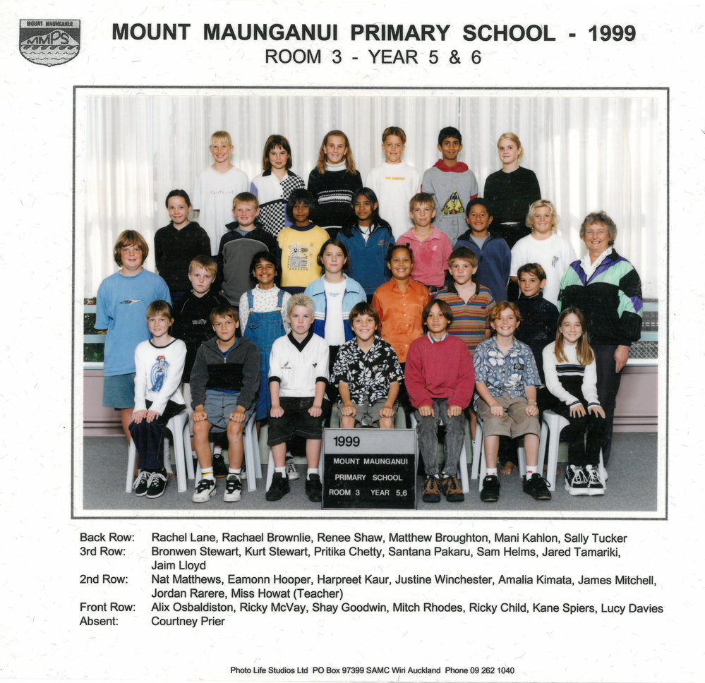 Date1999Reference NumberPhoto 13-1404DescriptionPhotograph of Mount Maunganui Primary School room 3 year 5 & 6 1999. From images collected during centenary celebrations 2013. Row 4: Rachel Lane – Rachael Brownlie – Renee Shaw – Matthew Broughton – Mani Kahlon - Sally TuckerRow 3: Bronwen Stewart – Kurt Stewart – Pritika Chetty – Santana Pakaru – Sam Helms - Jared Tamariki – Jaim LloydRow 2: Nat Matthews – Eamonn Hooper – Harpreet Kaur – Justine Winchester – Amalia Kimata - James Mitchell – Jordan Rarere – Miss HowatRow 1: Alix Osbaldiston – Ricky McVay – Shay Goodwin – Mitch Rhodes - Ricky Child – Kane Spiers - Lucy Davies Absent: Courtney PrierPhotograph of Mount Maunganui Primary School room 3 year 5 & 6 1999. From images collected during centenary celebrations 2013. Row 4: Rachel Lane – Rachael Brownlie – Renee Shaw – Matthew Broughton – Mani Kahlon - Sally TuckerRow 3: Bronwen Stewart – Kurt Stewart – Pritika Chetty – Santana Pakaru – Sam Helms - Jared Tamariki – Jaim LloydRow 2: Nat Matthews – Eamonn Hooper – Harpreet Kaur – Justine Winchester – Amalia Kimata - James Mitchell – Jordan Rarere – Miss HowatRow 1: Alix Osbaldiston – Ricky McVay – Shay Goodwin – Mitch Rhodes - Ricky Child – Kane Spiers - Lucy Davies Absent: Courtney PrierFormatPrint