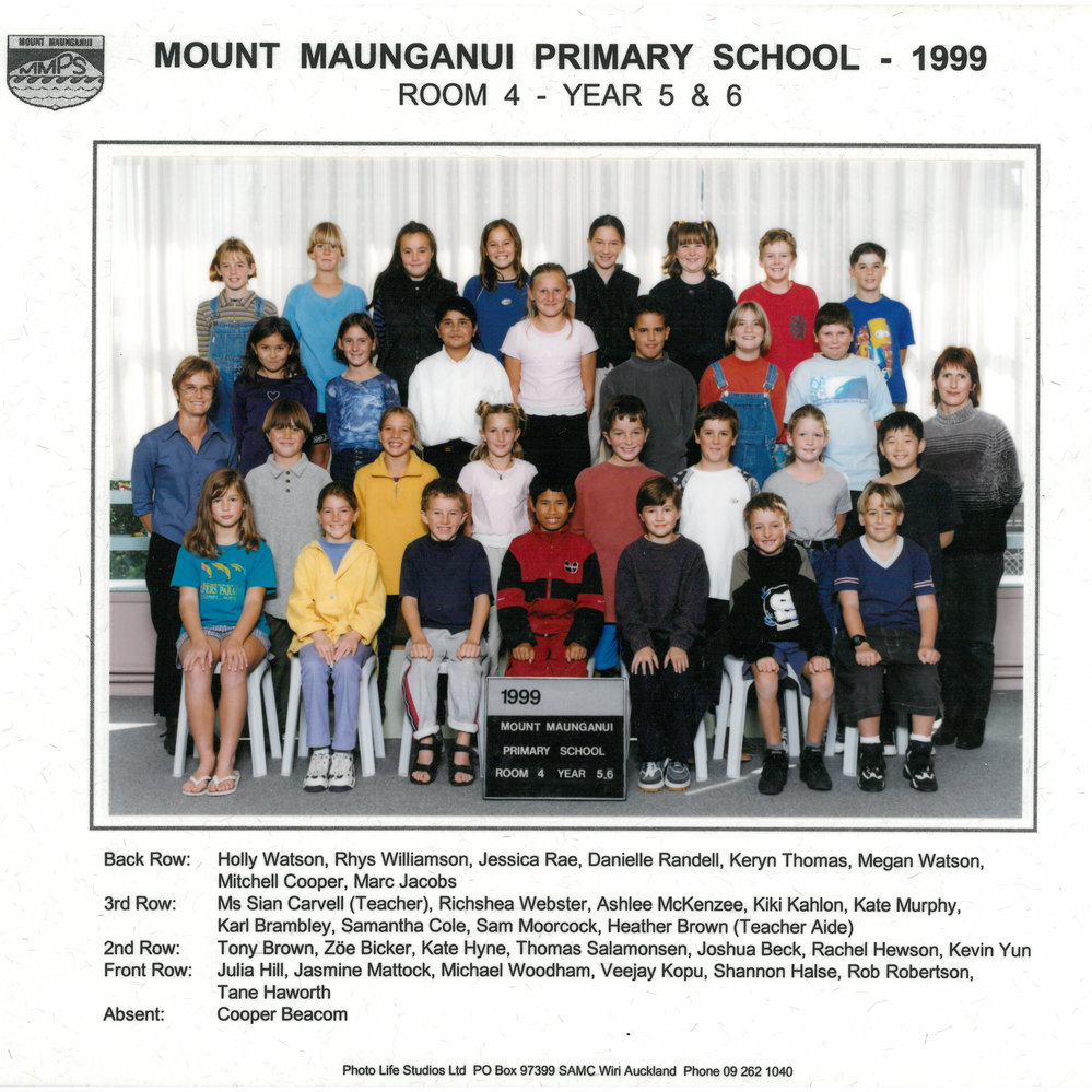 Date1999Reference NumberPhoto 13-1407DescriptionPhotograph of Mount Maunganui Primary School room 4 year 5 & 6 1999. From images collected during centenary celebrations 2013. Row 4: Holly Watson – Rhys Williamson – Jessica Rae – Danielle Randell – Keryn Thomas - Megan Watson – Mitchell Cooper – Marc JacobsRow 3: Ms Sian Carvell – Richshea Webster – Ashlee McKenzee – Kiki Kahlon – Kate Murphy - Kari Brambley – Samantha Cole – Sam Moorcock – Heather BrownRow 2: Tony Brown – Zoe Bicker – Kate Hyne – Thomas Salamonsen – Joshua Beck – Rachel Hewson - Kevin Yun Row 1: Julie Hill – Jasmine Mattock – Michael Woodham – Veejay Kōpū – Shannon Haise – Rob Robertson – Tane HaworthAbsent: Cooper BeacomPhotograph of Mount Maunganui Primary School room 4 year 5 & 6 1999. From images collected during centenary celebrations 2013. Row 4: Holly Watson – Rhys Williamson – Jessica Rae – Danielle Randell – Keryn Thomas - Megan Watson – Mitchell Cooper – Marc JacobsRow 3: Ms Sian Carvell – Richshea Webster – Ashlee McKenzee – Kiki Kahlon – Kate Murphy - Kari Brambley – Samantha Cole – Sam Moorcock – Heather BrownRow 2: Tony Brown – Zoe Bicker – Kate Hyne – Thomas Salamonsen – Joshua Beck – Rachel Hewson - Kevin Yun Row 1: Julie Hill – Jasmine Mattock – Michael Woodham – Veejay Kōpū – Shannon Haise – Rob Robertson – Tane HaworthAbsent: Cooper BeacomFormatPrint