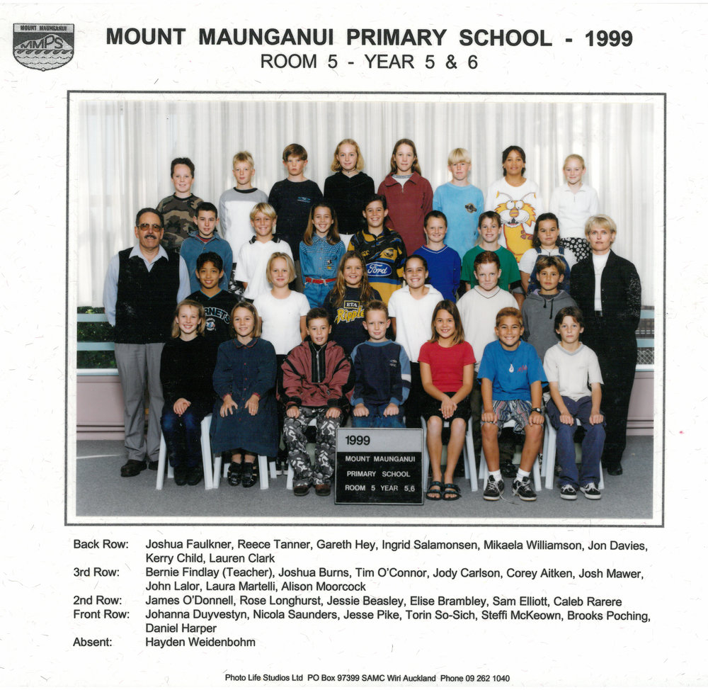 Date1999Reference NumberPhoto 13-1410DescriptionPhotograph of Mount Maunganui Primary School room 5 year 5 & 6 1999. From images collected during centenary celebrations 2013. Row 4: Joshua Faulkner – Reece Tanner – Gareth Hey – Ingrid Salamonsen – Mikaela Williamson - Jon Davies – Kerry Child – Lauren ClarkRow 3: Bernie Findlay – Joshua Burns – Tim O'Connor – Jody Carlson – Corey Aitken – Josh Mawer - John Lalor – Laura Martelli – Alison MoorcockRow 2: James O'Donnell – Rose Longhurst – Jessie Beasley – Elise Brambley – Sam Elliott - Caleb RarereRow 1: Johanna Duyvestyn – Nicola Saunders – Jesse Pike – Torin So-Sich – Steffi McKeown - Brooks Poching – Daniel HarperAbsent: Hayden WeidenbohmPhotograph of Mount Maunganui Primary School room 5 year 5 & 6 1999. From images collected during centenary celebrations 2013. Row 4: Joshua Faulkner – Reece Tanner – Gareth Hey – Ingrid Salamonsen – Mikaela Williamson - Jon Davies – Kerry Child – Lauren ClarkRow 3: Bernie Findlay – Joshua Burns – Tim O'Connor – Jody Carlson – Corey Aitken – Josh Mawer - John Lalor – Laura Martelli – Alison MoorcockRow 2: James O'Donnell – Rose Longhurst – Jessie Beasley – Elise Brambley – Sam Elliott - Caleb RarereRow 1: Johanna Duyvestyn – Nicola Saunders – Jesse Pike – Torin So-Sich – Steffi McKeown - Brooks Poching – Daniel HarperAbsent: Hayden WeidenbohmFormatPrint