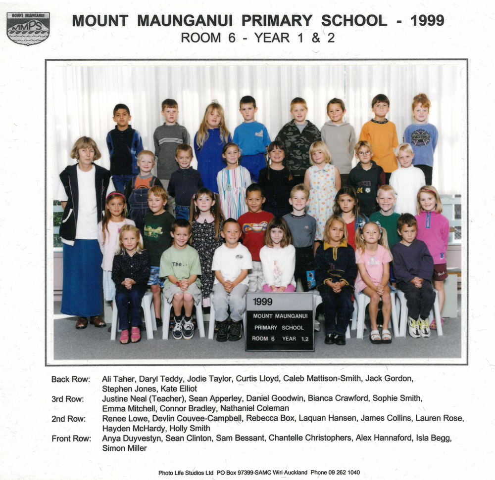 Date1999Reference NumberPhoto 13-1412DescriptionPhotograph of Mount Maunganui Primary School room 6 year 1 & 2 1999. From images collected during centenary celebrations 2013. Row 4: Ali Taher – Daryl Teddy – Jodie Taylor – Curtis Lloyd – Caleb Mattison-Smith – Jack Gordon - Stephen Jones – Kate ElliotRow 3: Justine Neal – Sean Apperley – Daniel Goodwin – Bianca Crawford – Sophie Smith - Emma Mitchell - Connor Bradley – Nathaniel ColemanRow 2: Renee Lowe – Devlin Couvee-Campbell – Rebecca Box – Laquan Hansen – James Collins - Lauren Rose – Hayden McHardy – Holly SmithRow 1: Anya Duyvestyn – Sean Clinton – Sam Bessant – Chantelle Christophers – Alex Hannaford - Isla Begg – Simon MillerPhotograph of Mount Maunganui Primary School room 6 year 1 & 2 1999. From images collected during centenary celebrations 2013. Row 4: Ali Taher – Daryl Teddy – Jodie Taylor – Curtis Lloyd – Caleb Mattison-Smith – Jack Gordon - Stephen Jones – Kate ElliotRow 3: Justine Neal – Sean Apperley – Daniel Goodwin – Bianca Crawford – Sophie Smith - Emma Mitchell - Connor Bradley – Nathaniel ColemanRow 2: Renee Lowe – Devlin Couvee-Campbell – Rebecca Box – Laquan Hansen – James Collins - Lauren Rose – Hayden McHardy – Holly SmithRow 1: Anya Duyvestyn – Sean Clinton – Sam Bessant – Chantelle Christophers – Alex Hannaford - Isla Begg – Simon MillerFormatPrint